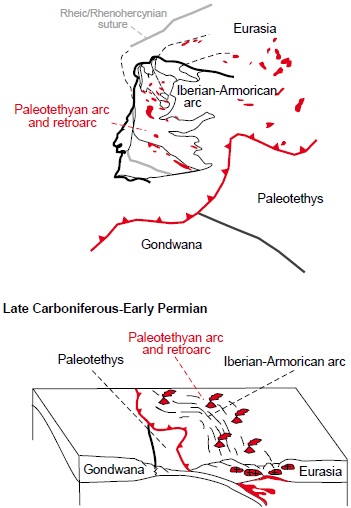 The generation of LC-EP post-kinematic I-type calcalkaline Iberian batholiths in a tectonic setting other than subduction conflicts with essential thermal requirements and phase equilibria constraints on metaluminous magma generation and fractionation (Pereira et al., 2015b). The emplacement and thermal effects of the LC-EP calcalkaline batholiths into a fertile middle crustal level, dominated by several kilometer-thick fertile EdiacaranCambrian metasedimentary successions, explains the late generation of S-type peraluminous granitic rocks and local hybridization of the intrusive magma, which became more peraluminous and potassic (Díaz Alvarado et al., 2011; 2013). The lower crust is usually mentioned as the source of the Iberian calc-alkaline batholiths based on the assumptions that they are intrusive into the middle crust and that melts produced from the mantle underlying the continental crust must be basaltic (Dias et al., 1998; Neiva et al., 2009, 2012; Villaseca et al., 2009, 2012). The new conception of subduction-related magmatism ownig to plume-assisted relamination (Gerya et al., 2004; Castro et al., 2010; Gerya and Meilick, 2011; Vogt et al., 2012) assumes that the generation of magmas of intermediate composition (andesite-diorite) occurs by means of the melting of subducted materials in silicic composite plumes, i.e. composed of oceanic crust and sediments. These materials are later relaminated to a level below the lower crust, where they split by melt segregation into liquids that are emplaced in the middle and upper crust (batholiths) and residues that remain in the lower crust as mafic granulites (Castro, 2013, 2014). In the case of the LC-EP calc-alkaline Iberian magmatism, several factors indicate an extra-crustal origin (Castro et al., 2010, 2013; Castro, 2013, 2014; Pereira et al., 2015b). The LC-EP Iberian batholiths have close compositional similarities with the calc-alkaline silicic magmatism of active continental margins as the Andes (Patagonian batholith) and the North American Cordillera (Sierra Nevada batholith). They also include arc-related appinitic rocks, suggesting a link to a subduction setting (Murphy, 2013) similar to that of the post-Paleozoic Cordilleran batholiths formed at the Pacific active margin of the Americas (Castro et al., 2011). The period during which LC-EP calc-alkaline magmatism was generated (ca. 315-280Ma) coincides with the development of the Iberian-Armorican Arc (Fig. 11) (i.e. Cantabrian orocline; Gutiérrez-Alonso et al., 2008, 2011; Fernández-Suárez et al., 2011; Weil et al., 2012; Johnston et al., 2013), which was probably related to the Pangaea self-subduction (Gutiérrez-Alonso et al., 2008, 2011). In a global context, during the Late Carboniferous the western zones of the Iberian Massif were affected by the late stages of the Laurussia-Gondwana convergence, whereas the subduction of the Paleotethyan Ocean prevailed during and after LC-EP times (Cimmerian cycle) along the Eurasian eastern domains (Stampfli and Borel, 2002; Stampfli et al., 2013) (Fig. 11). The progression of the Paleotethys subduction led to the collision between Cimmerian terranes (detached from the non-collisional northern margin of Gondwana) and the Eurasian active margin (Cocks and Torsvik, 2006; Stampfli and Kozur, 2006), which can explain the inception of a LC-EP Paleotethyan magmatic arc in Iberia (Fig. 11; Pereira et al., 2015b).