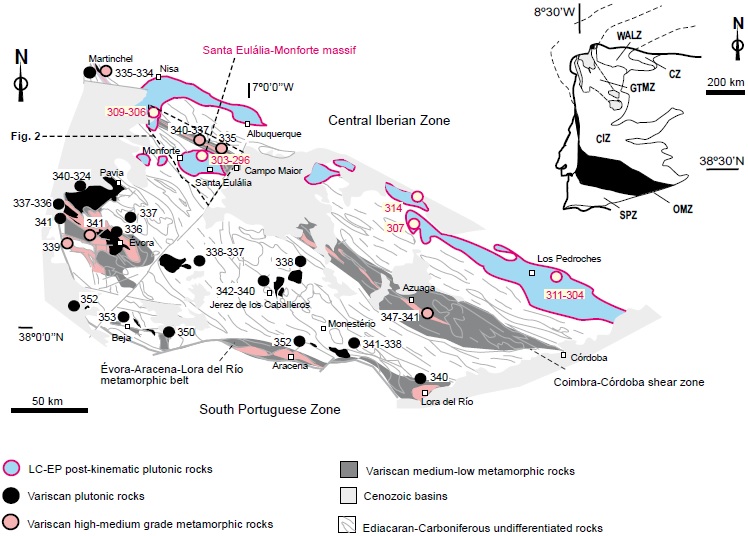 The LC-EP post-kinematic intrusions are abundant in the Central Iberian Zone, but are relatively less represented in the Ossa-Morena Zone. The Nisa-Albuquerque massif is a composite elongated body oriented parallel to, and crossing, the boundary between the Central Iberian and Ossa-Morena zones (González Menéndez, 2002) (Fig. 1). This post-kinematic intrusion consists of a dominant S-type monzogranite-syenogranite (ca. 309-307Ma) that surrounds a discontinuous core of I-type tonalitegranodiorite (ca. 306Ma) (SHRIMP zircon U-Pb dating; Solá et al., 2009). The Santa Eulália-Monforte massif, located in the northern domains of the Ossa-Morena Zone, is a composite intrusion (Gonçalves and Coelho, 1969-1970; Gonçalves, 1971; Gonçalves et al., 1972, 1975; Carrilho Lopes et al., 1998; Sant’Ovaia et al., 2015) consisting of S- and I-type granites and mafic-intermediate bodies (González Menéndez et al., 2006). Rb-Sr wholerock ages of ca. 281Ma (Mendes, 1967-1968) and of ca. 290Ma (Pinto et al., 1987) have been, for decades, the only available isotopic ages performed on granites from the Santa Eulália-Monforte massif.