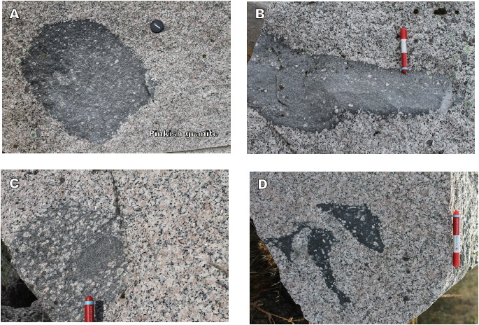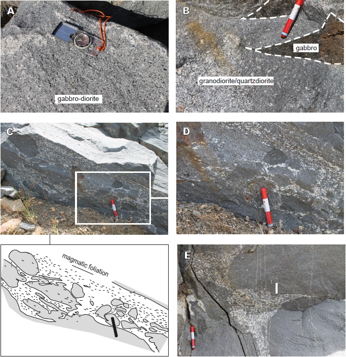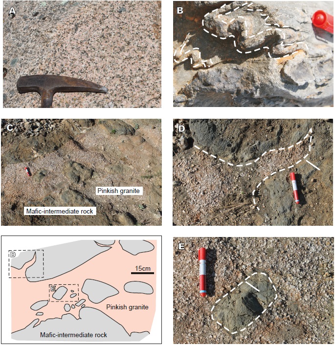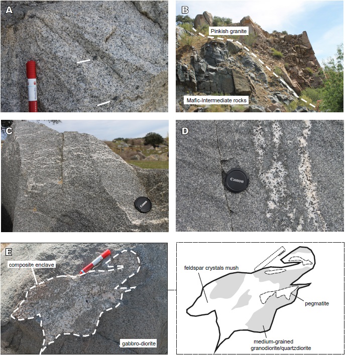 Field relationships show that the greyish granite from the core (Fig. 3A) intrudes both the pinkish granite (Fig. 6A) and the associated mafic-intermediate rocks (Fig. 4A). Maficintermediate bodies at the eastern margin of the Santa Eulália-Monforte massif are intruded by the pinkish granite (Figs. 3B and 6C, D, E). Angular mafic enclaves (Fig. 5B) seem to represent early cooled pieces of gabbro caught up in the granodiorite-quartzdiorite-tonalite magma, but the variation from sharp though irregular contacts to more diffuse contacts suggests that they are contemporaneous (Fig. 4E). It is notable the presence of composite enclaves (Fig. 3E) and irregular patches of granodioritequartzdiorite-tonalite (Fig. 3D) hosted by gabbro-diorite, together with a channel-like enclave swarm of maficintermediate rocks (Fig. 4C; D) suggest intermingling of two magmas. Gabbro-dioritic rocks include leucocratic veins and lenses of quartzdiorite and/or tonalite (Fig. 3C; D). The occurrence of K-feldspar within the gabbro-dioritic enclaves, which may be the same as that of the host granitic rock (Fig. 5), suggests that granitic magma could have interacted with the mafic-intermediate magmas, probably at a time when both were not completely crystallized. The existence of mafic-intermediate enclaves with irregular, rounded and elliptical shapes, suggests mingling with the host granitic magma (Fig. 5).