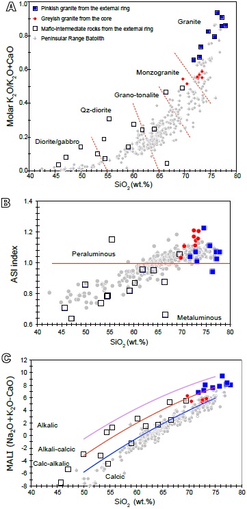 The core of this ring-shaped intrusion consists of S-(prevailing) and I-type high-K calc-alkaline peraluminous granite ranging in composition from monzogranite to granite (Fig. 7A; B). Quartz, plagioclase, microcline, biotite and muscovite are the main minerals, being also present cordierite (Fig. 3A). The geochemistry of the greyish granite suggests the derivation from a mixed source of metasedimentary (dominant) with intermediate to acid igneous rocks extracted from the mid-lower crust (González Menéndez et al., 2006). The external pinkish granite is composed of quartz, biotite, and K-feldspar prevails in respect to plagioclase. It also contains chlorite, amphibole, allanite and zircon. The available geochemical data (Carrilho Lopes et al., 1998; González Menéndez et al., 2006) indicate that it is an I-type high-K calc-alkaline peraluminous granite (Fig. 7A; C). The pinkish granite is interpreted to derive from partial melting of intermediate composition gneissic rocks from the mid-lower crust (González Menéndez et al., 2006).