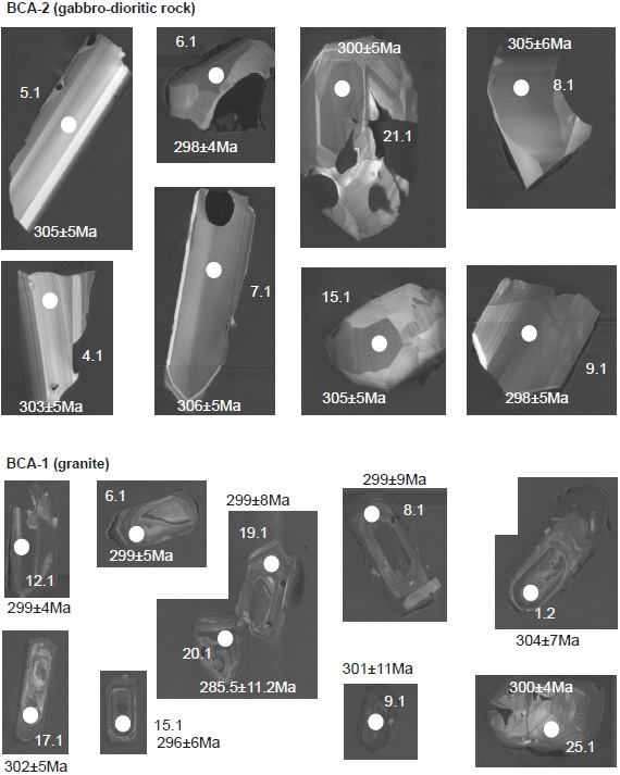 Zircon separation from a sample of granite (MFT-1) and a sample of gabbro-diorite (BCA-2) of the external ring of the Santa Eulália-Monforte massif (sampling sites on Fig. 2) was performed by means of traditional techniques using dense liquids and magnetic separation at the University of Évora (Portugal). Selected crystals were hand-picked using a binocular lens. Zircon concentrates were cast on a 3.5cm diameter epoxy mount, together with zircon standards (TEMORA zircon, SL13 zircon and GAL zircon), then polished and documented using SEM-CL (Fig. 8), at the IBERSIMS (University of Granada, Spain). Mounts were coated with gold (80-microns thick) and inserted into the SHRIMP for analysis.