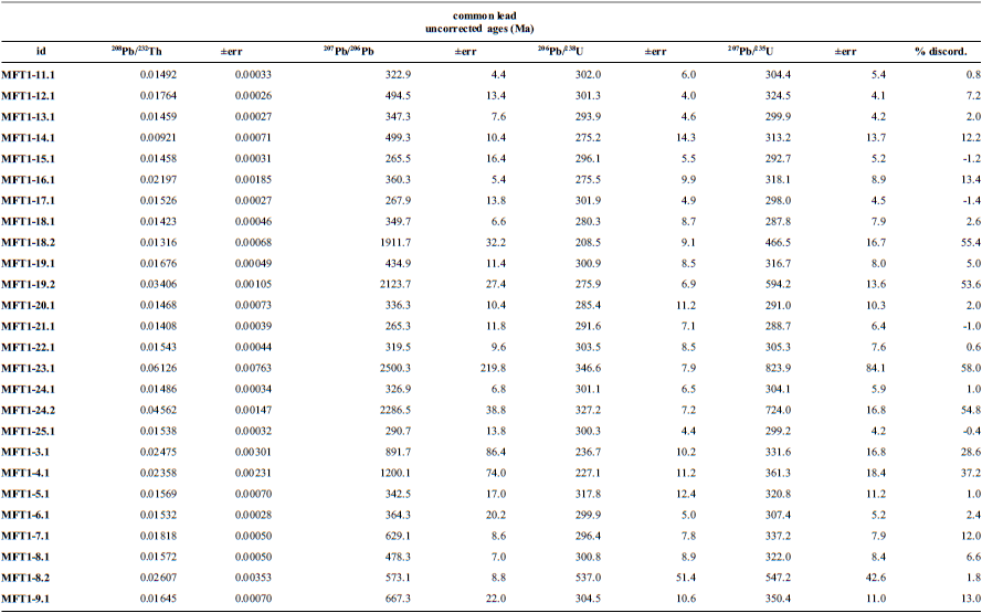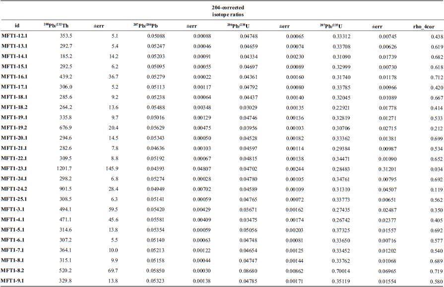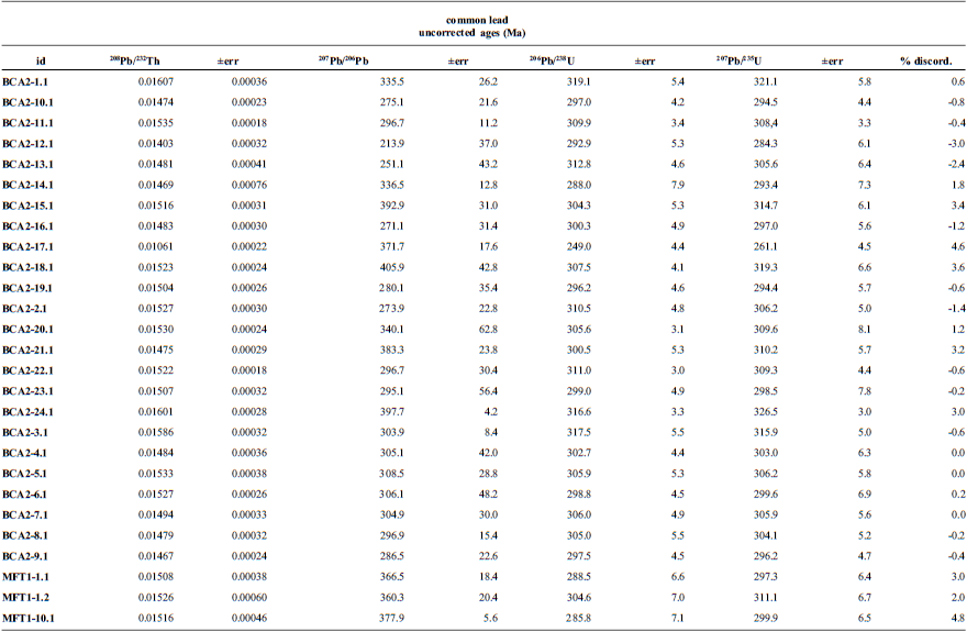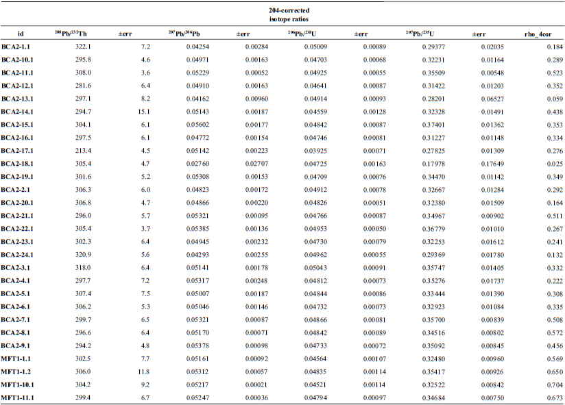 Point-to point errors, calculated on replicates of the TEMORA standard, are: 0.36% for 206Pb/238U, and 0.32% for 207Pb/206Pb