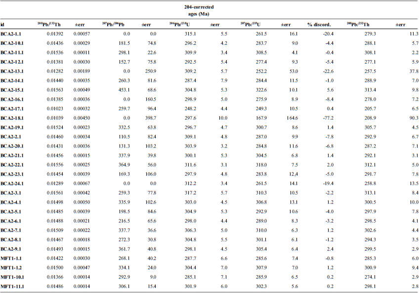 The Th/U ratios obtained from analyzed zircons of both samples (Fig. 10) prove the coexistence of two compositionally distinct magmas from which zircon crystallized during the evolutionary history of the bimodal magmatic chamber. The average Th/U ratio of the granite (0.40) is significantly lower than that of the gabbro-diorite (0.64), indicating felsic-intermediate metaluminous sources for the two magmas (Heaman et al., 1990; Hanchar and Miller, 1993, Hoskin and Schaltegger, 2003). In Figure 6, most zircon analyses of granite (sample MFT-1) are plotted in the range of 0.3<Th/U ratio<0.5, closer to the field of felsic peraluminous sources, in which probably there is abundant monazite (Th>U), and lower than those from the gabbro-diorite (sample BCA-2), in the range of 0.5<Th/U ratio<0.7, in which there is no other U-Th accessory.