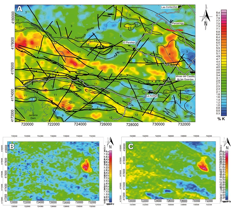 The radiometric data is part of a geophysical flight done in the Iberian Pyrite Belt between November 1996 and April 1997 with a spacing of 250 meters and a nominal height of 80 meters. These data are available from the Geophysical Information System of IGME (SIGEOF; http://info.igme.es/sigeof/). The lines corresponding to the %K, ppm Th and ppm U were processed at the unit of geophysics and remote sensing of IGME. The images of the potassium concentration and the ternary (combination of U, Th and K) do provide a strong contrasting signal with the surrounding country rock. The image of the potassium concentration shows a clear positive anomaly with values over 6% that match the outline of the granite mapped in the field (Fig. 9). Along the northern boundary, the anomaly goes beyond the mapped area suggesting that the granite extents a little bit further up. On the southeastern corner of the granite, the anomaly is weak due to the fault contact between the granite and gabbro-diorite with a lower radiometric response. The central part of the granite also shows strong Th (>21ppm) and U (>5ppm) positive anomalies (Figs. 9B and C). The same type of geophysical anomalies has been observed in the Berrocal granite (Bellido et al., 2006), a similar S-type peraluminous granite located in the NE sector of SPZ.
