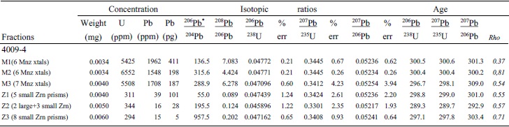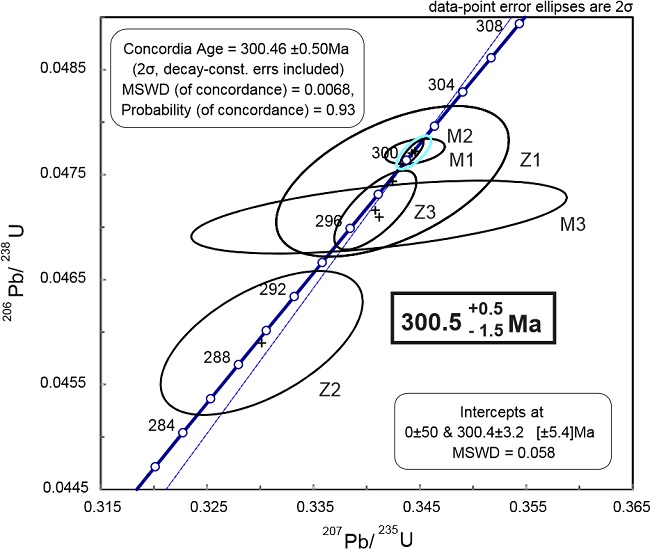 A total of three monazite and three zircon fractions were analyzed (Table 2). All fractions are concordant to subconcordant, overlapping the Concordia curve between 300 and 290Ma (Fig. 10). The six fractions define a Discordia line with an upper intercept age of 300±3Ma. This upper intercept age is anchored by two concordant monazite fractions with a “Concordia age” of 300.5±0.5Ma (Fig. 10). The other monazite fraction, which had measurement problems during mass spectrometry, is slightly discordant. The zircon fractions are also slightly discordant, suggesting that minor secondary Pb-loss was still present, despite the chemical abrasion. Fractions Z1 and Z3 are collinear with the Discordia line, fraction Z2 is slightly off to the left but within error. Considering the whole data set, the two concordant monazite fractions with an age of 300.5±0.5Ma provide the best age estimate. However, in order to avoid underestimating the error, we prefer to expand the lower error to include an overlap with the centroid of zircon fraction Z1, and quote an age of 300.5+0.5/-1.5Ma as our most accurate estimate for the age of granite intrusion.