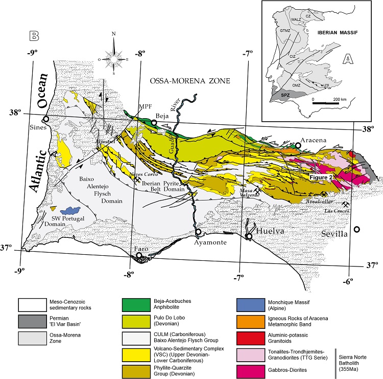 The South-Portuguese Zone (SPZ) constitutes the southern foreland of the Iberian Massif (e.g.Oliveira, 1990). This external zone has been correlated with the Rheno-Hercynian Zone of the Variscan Belt in Belgium and Germany and with the Variscan foreland of the British Isles (Oliveira et al., 1979; Franke, 1992; von Raumer et al., 2003). According to Oliveira (1990), the SPZ is divided into five major domains, from north to south: Beja-Acebuches “ophiolitic” domain, Pulo do Lobo antiform, Iberian Pyrite Belt domain, Flysch of Baixo Alentejo, and SW Portugal (Bordeira and Aljeruz antiforms).