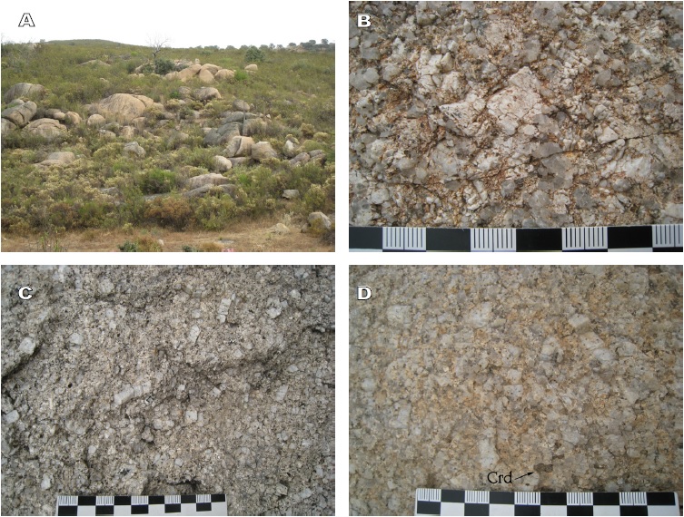 The El Crispinejo granite is located to the northwest of the village of Minas del Castillo de las Guardas (province of Seville). It is a small (ca. 2km2) plutonic body of porphyritic granite, which intrudes the granitoids of the TTG series of the Sierra Norte Batholith (Figs. 1 and 2). Weathering of the granite results in a topographic low, which is crossed by El Crispinejo stream. The granite crops out quite well in the vicinity of the stream (Fig. 3), forming metric boulders with subangular shapes due to a well-developed joint system. When fresh, the rock has a white to light grey colour, and ranges from medium-coarse (5-7mm) to medium (2-5mm) grain size. The medium-size facies occupy the northern portion of the pluton, near the intersection of the El Crispinejo and La Siguereja stream, while the coarser facies are observed in the southern portion of the intrusion. The porphyritic character of the intrusion is given by the presence of dispersed, tabular (2-4cm x 1cm), K-feldspar megacrystals with a 10-20cm2 spacing between them (Fig. 3). The two-micas granitic groundmass range from medium-coarse (5-7mm) to medium (2-5mm) grain size. A very distinctive character of this intrusion is the presence of cordierite prisms up to 10mm in length (Fig. 3D), which is quite unique among intrusion of the SPZ. The facies with medium-size groundmass occupies the northern portion of the pluton, near the intersection of the El Crispinejo and La Siguereja stream, while the coarser facies are observed in the southern portion of the intrusion.