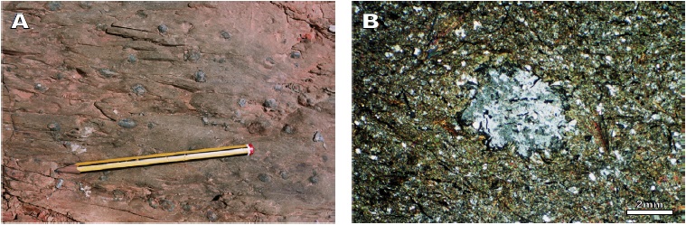 Along its southern border (Fig. 2), the granite intrudes rocks of the VSC, generating contact metamorphism (Fig. 4). Cordierite blasts are produced in the pelitic members of the surrounding VSC. The granite also cuts minor folds in the VSC suggesting that it is a late intrusion.