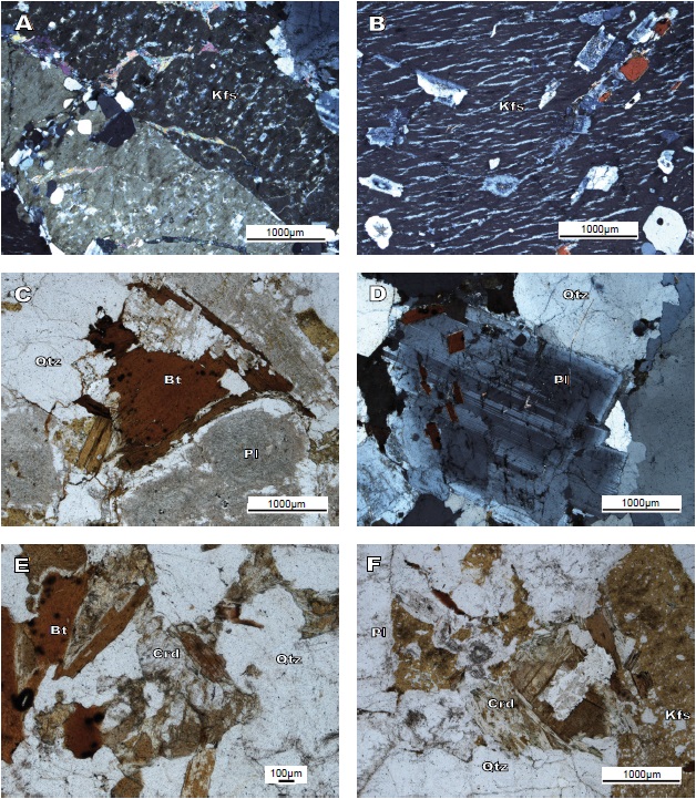 The K-feldspar crystals occur as large megacrystals and in the groundmass of the porphyritic granite. They display tabular hypidiomorphic shapes with microcline and Carlsbad twins (Fig. 5A), and “film” and “vein” perthitic textures. The K-feldspars are rich in inclusions of quartz, biotite and plagioclase. These inclusions are often disposed parallel to the borders of the megacrysts (Fig. 5B). Where the K-feldspar crystals are in contact with each other, there is intergranular, polycrystalline, plagioclase in interstitial position. The plagioclase crystals are hypidiomorphic showing polysynthetic twins and occasional concentric zoning (Fig. 5D). When zoned, the core of the plagioclase crystals is retrogressed to a very fined grained aggregate of sericite, epidote and calcite. Biotite is present in the groundmass as forming aggregates of 3 to 6 crystals. It has a hypidiomorphic shape with reddish brown to yellow brown pleochroism (Fig. 5C), and displays zircon and monazite inclusions. The biotite is variably altered and transformed by chloritization. Muscovite occurs in the groundmass as euhedral crystals, suggesting a primary origin. It also occurs as anhedral crystals with biotite inclusions and as anhedral inclusions in the twins and exfoliation planes of K-feldspar, indicating a secondary origin. Although, not a major mineral, cordierite can be observed as hypidiomorphic and euhedral prims up to 10mm in length (Fig 5E). Often it is retrogressed, but fresh crystals are also preserved. When retrogressed cordierite is transformed by pinnitization or transformed to a mica aggregate (muscovite+biotite+chlorite) (Fig. 5F).