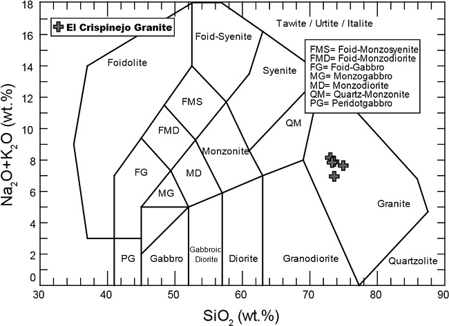 This granite has a high but narrow range of SiO. content (73.64-75.28%; Fig. 6). The sample shows a very small compositional variation with low CaO, Fe2O3t and MgO values. According to the major element classification scheme of Middlemost (1994; Fig. 6), the samples plots in the granite field. The cordieritebearing El Crispinejo granite has the classic mineralogy of S-type peraluminous granites (Chappell and White, 1974). The peraluminous character is confirmed by an alumina saturation index (ASI) between 1.1 and 1.3, and the presence of normative corundum (1.5-2.8).