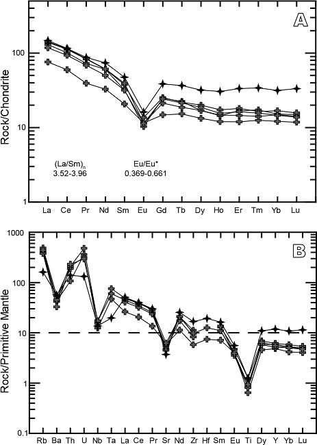 The granite has a moderately fractionated chondritenormalized REE pattern (Fig. 7A; La/YbN=5.9-9.18), with an enrichment in LREE (La/SmN= 3.52-3.96), a negative Eu anomaly (Eu/Eu*=0.37-0.67) and almost flat HREE (Gd/YbN=1.2-1.6). When normalized to “Primitive mantle” (Sun and McDonough, 1989; Fig. 7B), the pattern shows significant negative anomalies in Ba, Nb, Sr, Eu and Ti, that could be attributed to fractionation of plagioclase, K-feldspar and biotite, and positive anomalies in Th and U.