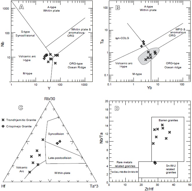 The El Crispinejo granite is, therefore, enriched in K2O, Rb, Th and Ta, and has average to low values of Zr, Hf, Sm, Y, Yb and Sr and a peraluminous character typical of collisional granites (Pearce et al., 1984; Harris et al., 1986; Pearce, 1996a). The granite tectonic discrimination diagrams of Pearce et al. (1984, 1996b; Fig. 8) show that while the trondhjemitic granitoids of the SNB plot at the boundary of the volcanic arc (VAG), within-plate and ocean-ridge (ORG) granite field, the El Crispinejo granite plots in a separate position at the boundary of the syn-collisional –VAG field. This position is typical of collisional granites (Pearce et al., 1984; Pearce, 1996b), as confirmed by the Rb-HfTa diagram of Harris et al. (1986; Fig.8C). In the Nb/Ta-Zr/Hf diagram of Ballouard et al. (2016; Fig. 8D) the granite plots in the field of the Sn-W mineralized granites. So, the geochemistry of the granite confirms the field and petrographic observations that conclude that it is late- to post-collisional, peraluminous, S-type granite with associated Sn-W mineralization.