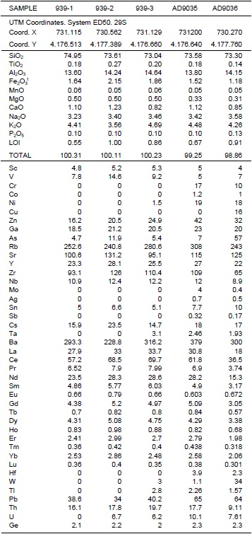 Major and trace element analyses were done in five representative samples from El Crispinejo granite (Table 1). This also includes samples AD9035 and AD9036 from Díez-Montes et al. (1999). For comparison purposes, in order to show the difference between this granite and surrounding granitoids of the Sierra Norte Batholith, samples from the country rock trondhjemitic granitoids are displayed in the diagrams, these data are from Díez-Montes et al. (1999). All the analyses, including sample preparation, were done at the IGME laboratories. Major elements were done by XRF and AAS (Na). The trace element analyses were done by XRF on press-pellets using pro-trace software, while the REE´s were done by ICPMS on fused pellets.