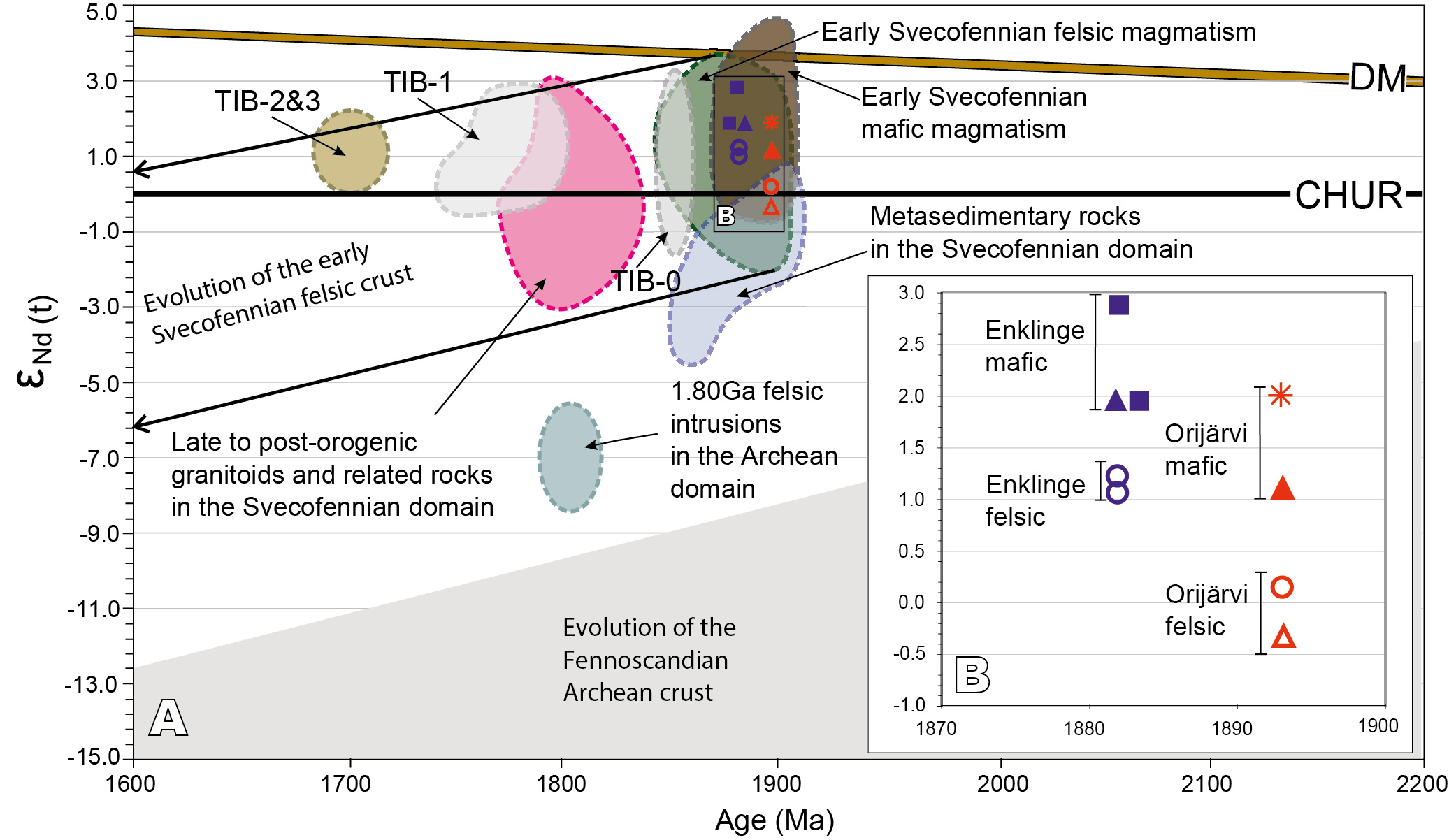 The Enklinge mafic rocks show slightly higher initial εNd values than the Orijärvi mafic rocks which suggests a slightly more primitive signature of the former. This is supported also by the initial εNd values: around +1 in the felsic rocks from Enklinge and around zero from Orijärvi.