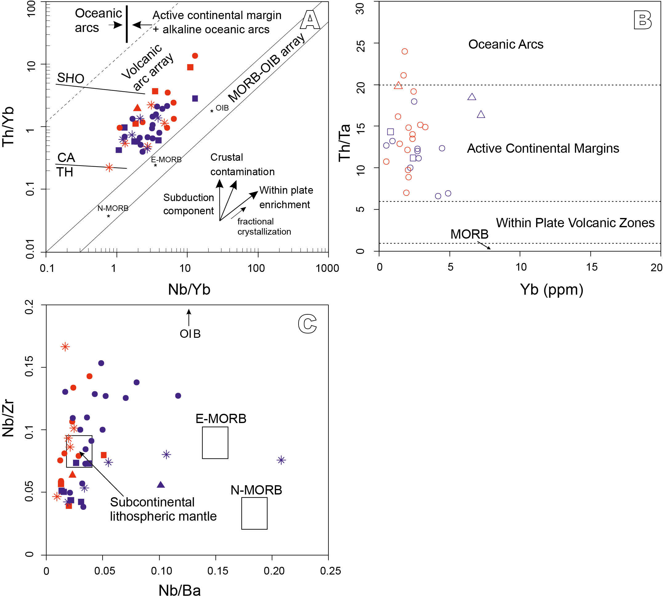 The Enklinge and Orijärvi igneous rocks have formed in a subduction-related volcanic arc environment (e.g. Colley and Westra, 1987; Ehlers and Lindroos, 1990; Kähkönen, 2005). The distinct subduction component can be seen in all the samples with pronounced troughs at Nb and Ta, and peaks at the subduction-mobile elements such as Ba, Th, U, Pb and Sr in the multi-element diagrams (Fig. 7). This feature is emphasised by fractionated REE pattern for the mafic rocks, as well as the felsic ones (Fig. 7). On the Th/Yb vs. Nb/Yb diagram all the mafic samples plot above the MORB-OIB array (Pearce and Peate, 1995; Pearce, 2008) and show Nb/Yb ratios ≥1.0, suggesting an Active Continental Margin (ACM) setting rather than oceanic arc type magmatism (Fig. 12A). The same feature can be observed on the Th/Ta vs. Yb diagram (Schandl and Gorton, 2002), which shows ACM affinity for the felsic rocks (Fig. 12B). The wide range of rocks with intermediate and felsic compositions also support a continental setting as these form more easily from pre-existing continental crust (e.g. Tatsumi and Takahashi, 2006). However, part of the intermediate rocks is supposed to result from magma mixing (Fig. 3). The Nb/Zr vs. Nb/Ba diagram (Fig. 12C) indicates a SubContinental Lithospheric Mantle (SCLM) source for the mafic magmas.