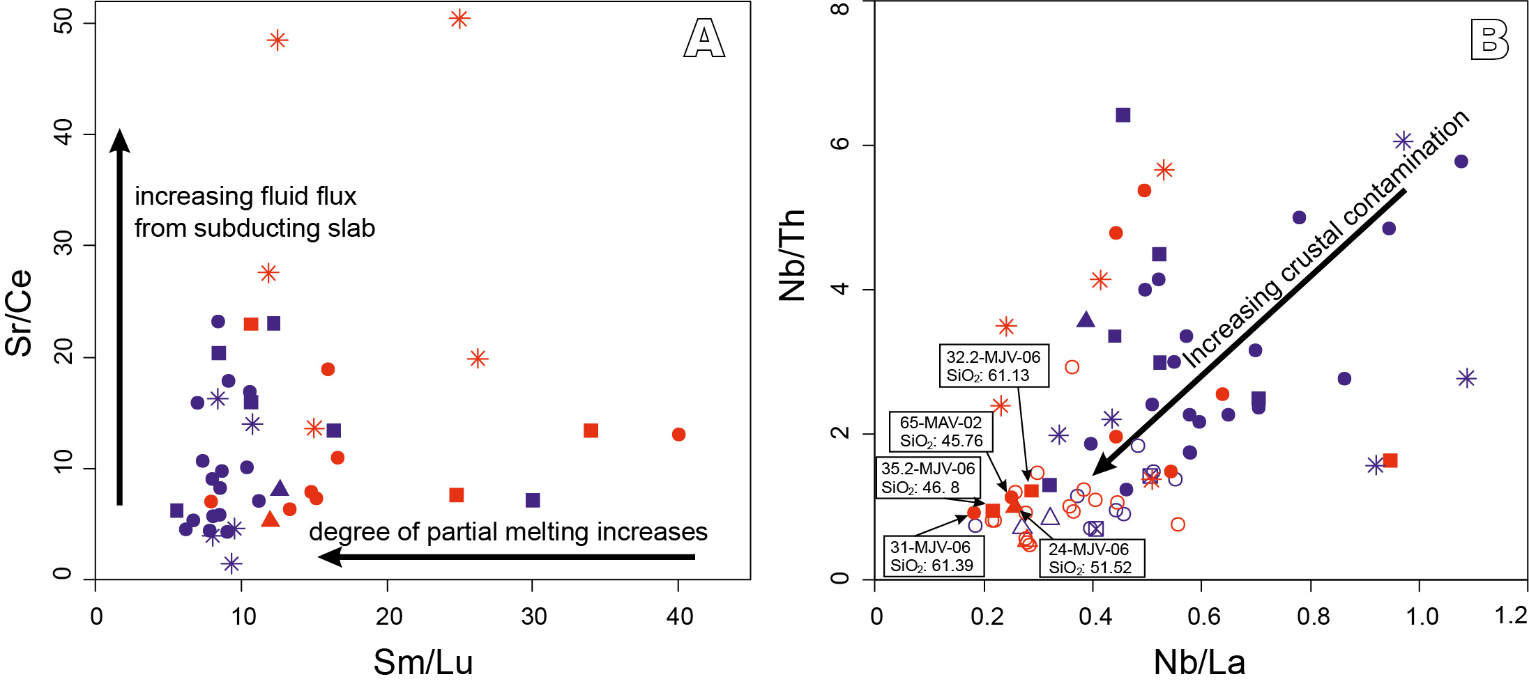 A) Partial melting and subducting slab fluid signal in the mafic rocks. Sm/Lu ratio decreases with increasing partial melting, while Sr/Ce ratioincreases with increasing amount of fluids derived from subducting slab. B) Nb/Th vs. Nb/La diagram suggesting crustal contamination in samples withlow values in both ratios. The felsic rocks and SiO2 content of selected mafic samples are included in the diagram to visualise magma mixing betweenmafic and felsic magmas. Symbols as in Figure 4.