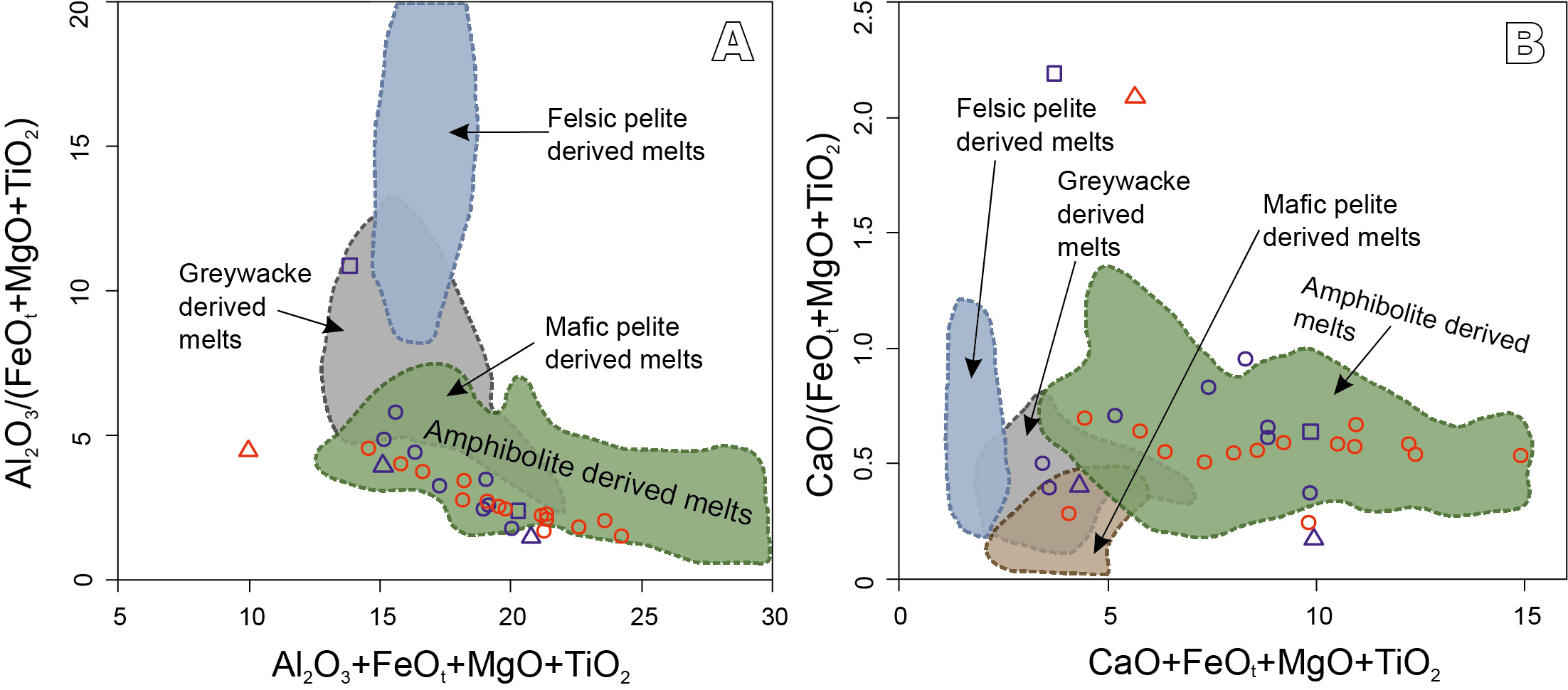 Sources for felsic rocks after Patiño Douce (1999). The “Mafic pelite derived melts” in diagram A) is exactly at the cross section of the “Greywacke derived melts” and the “Amphibolite derived melts” areas. Symbols as in Figure 4.