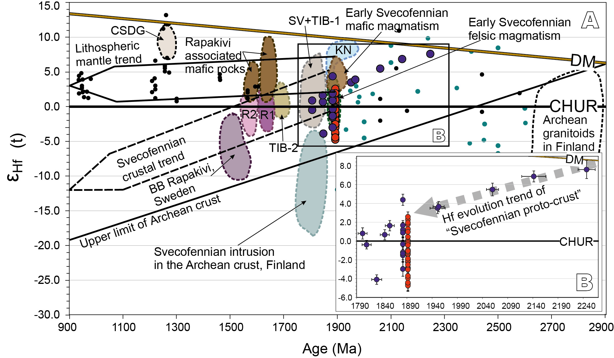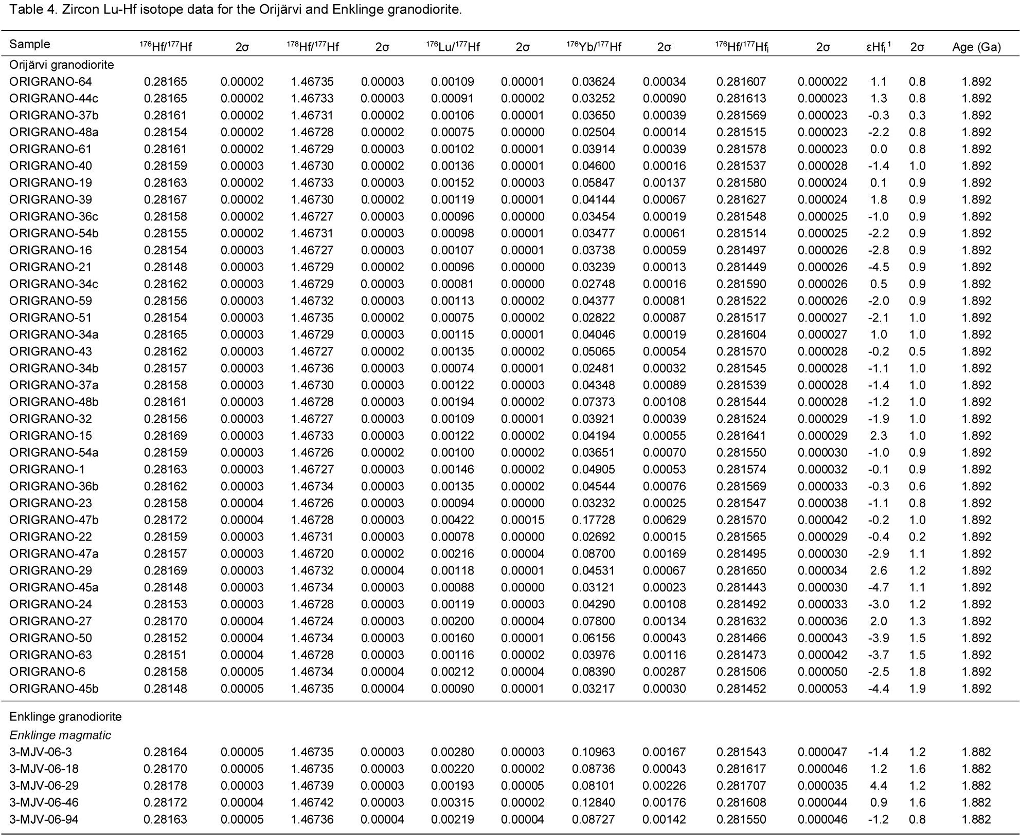 iv) The Lu-Hf data from the Orijärvi granodiorite (average initial εHf -1.1 at 1892Ma) and the Enklinge granodiorite (average initial εHf 0 at 1882Ma) are in accordance with the Nd data from the same rocks. The variation in the εHf (ca. 7ε units for both samples) is assumed to result from mixing between depleted parental mantle magmas and partial melts from crustal sources.