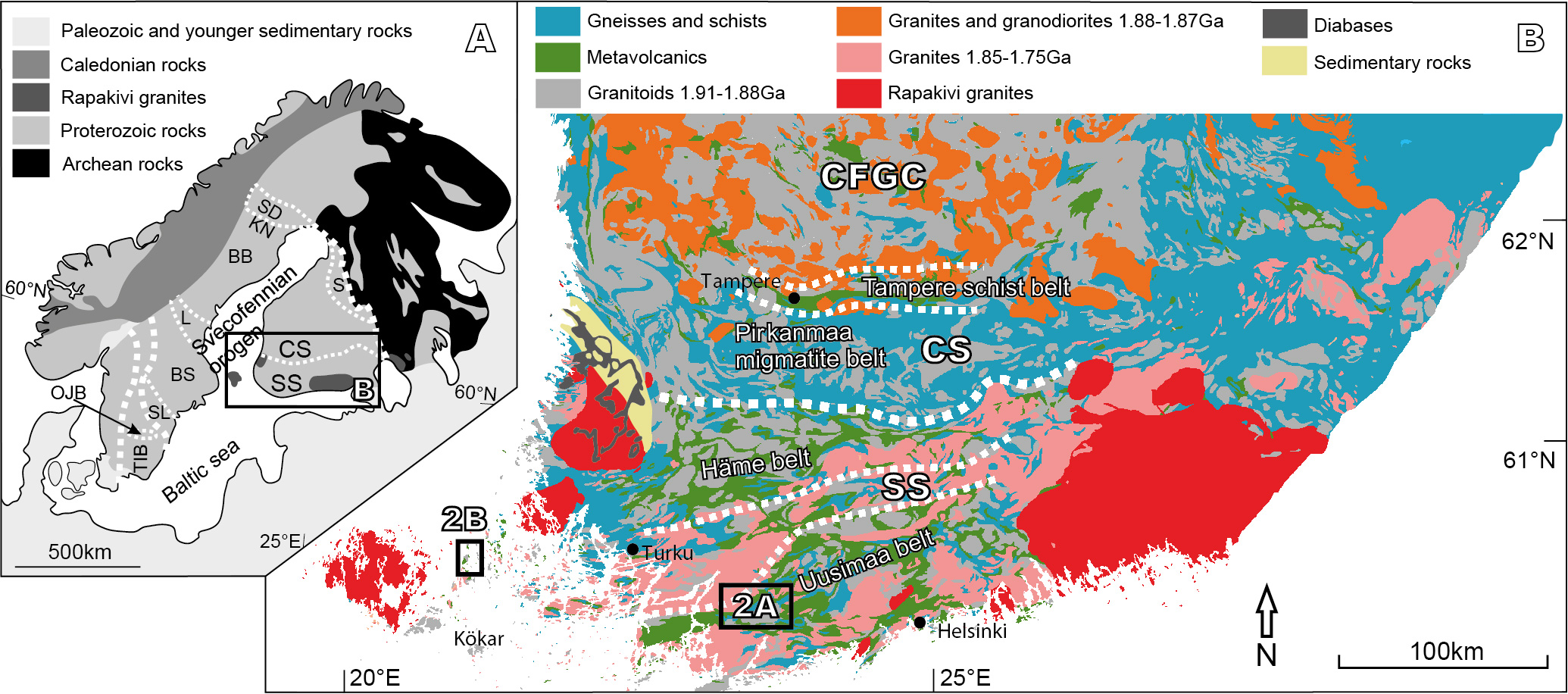 A) Geological overview of the Fennoscandian shield and proposed terrane distribution, modified after Koistinen et al. (2001). The thick white dashed lines represent the borders of the Svecofennian orogen and Transscandinavian igneous belt, whereas the narrow-dashed lines represent proposed terrane boundaries within the Svecofennian orogen. CS=Central Svecofennia, SS=Southern Svecofennia, S=Savo arc, SD=Skellefte District, KN=Knaften arc, BB=Bothian Basin, L=Ljusdal lithotectonic unit, BS=Bergslagen lithotectonic unit, SL=Småland Lithotectonic unit, TIB=Transscandinavian Igneous Belt, OJB=Oskarshamn-Jönköping Belt. Area of map B) is indicated by a black rectangle. B) General geological map of southern Finland, modified after Kallioperä-Bedrock of Finland 1:200,000. CFGC=Central Finland Granitoid Complex. The white thicker dashed line represents proposed border between Central and Southern Svecofennia (CS and SS, respectively), whereas the white narrower lines represent proposed borders of the other major lithotectonic units. Study areas indicated by black rectangles (2A=Orijärvi, 2B=Enklinge).