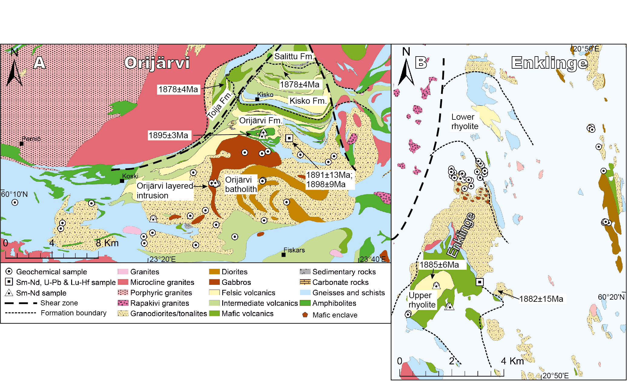 i) The Enklinge and Orijärvi volcanic rocks have formed in a continental volcanic arc environment. The intrusive and extrusive rocks are co-genetic, and the felsic and mafic rocks are coeval but not co-magmatic based on field observations, geochemical, age and isotopic data in both study areas. The differences between the Orijärvi and Enklinge mafic rocks are most likely due to a more extensive partial melting in the Enklinge area or a larger crustal contamination in the Orijärvi area.
