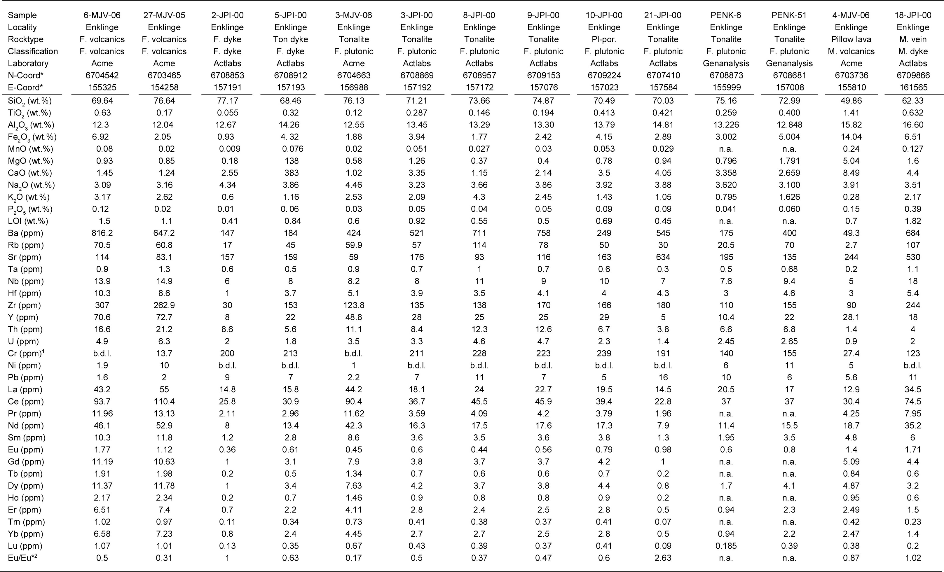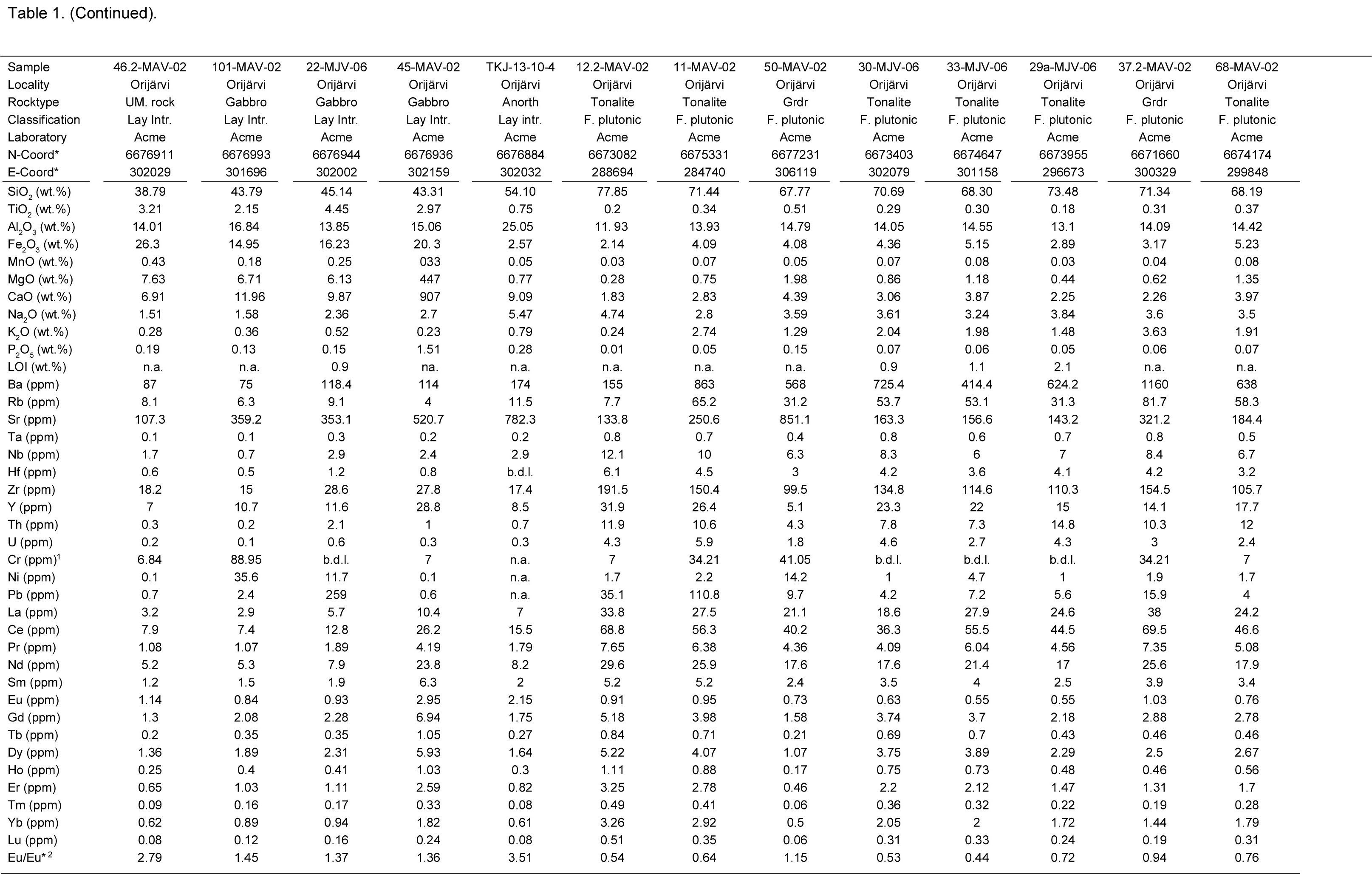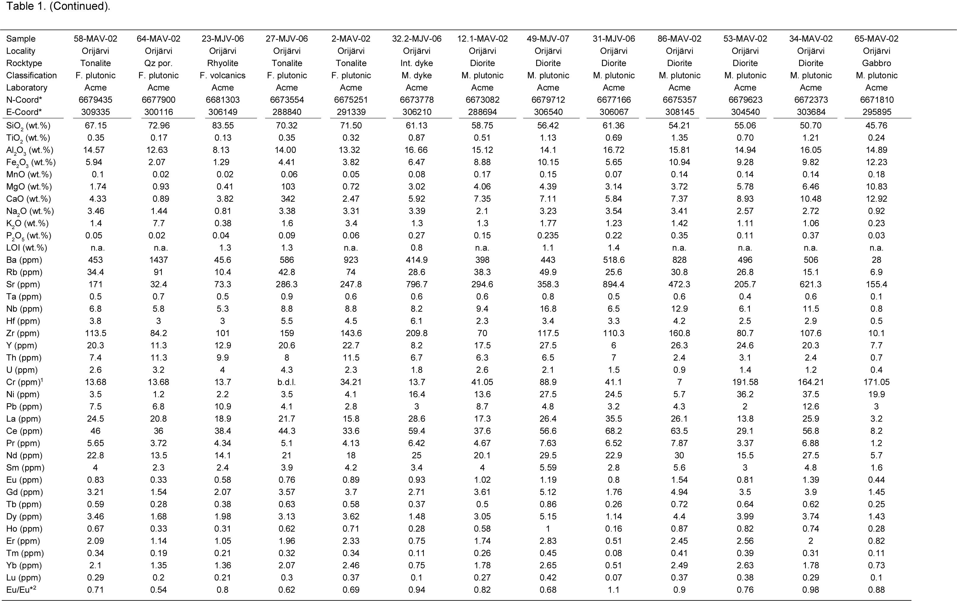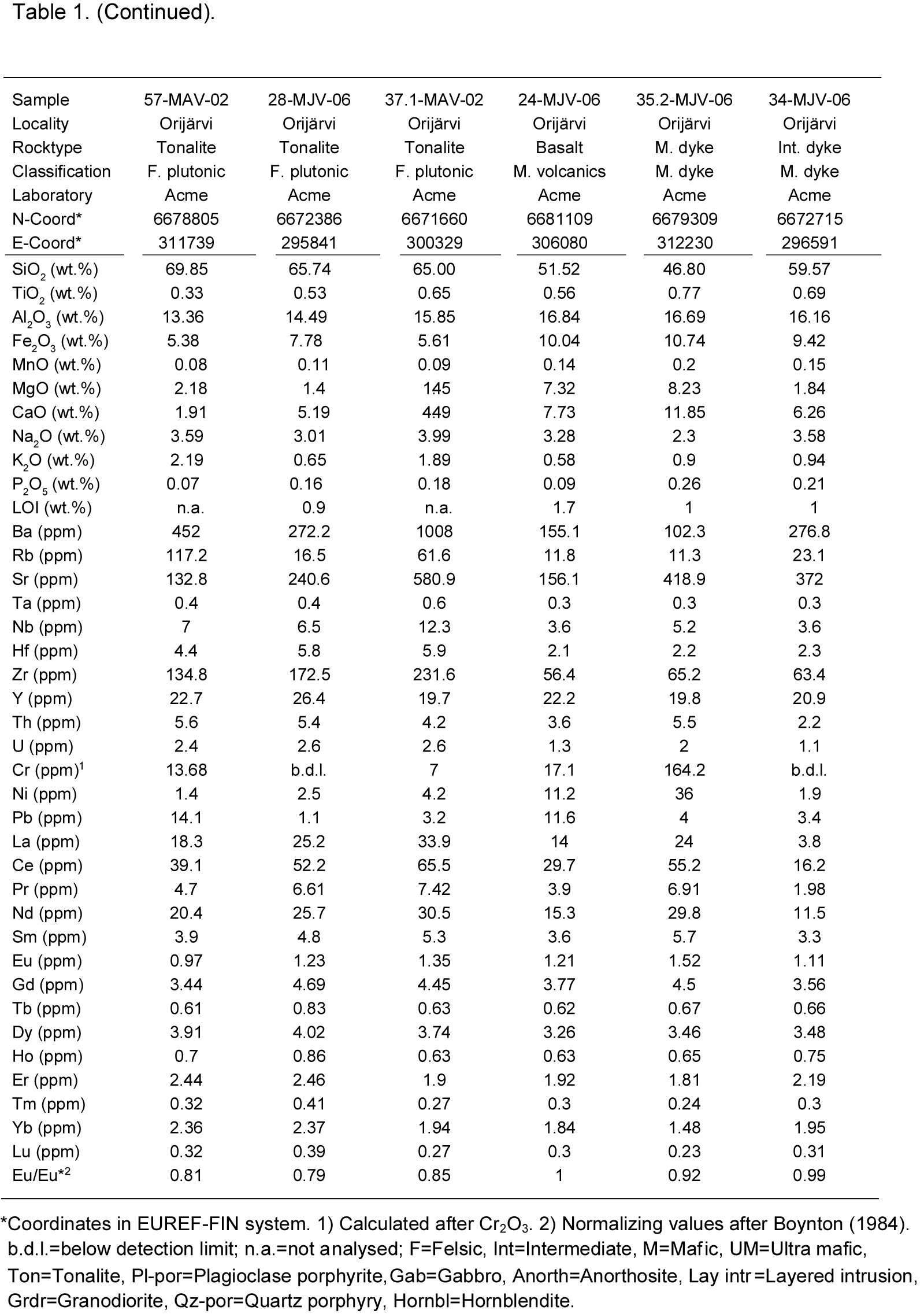 A total of 75 whole-rock samples were studied, of which 34 were from Orijärvi and 41 from Enklinge. The data include plutonic, dyke and volcanic rock samples. The Orijärvi and part of the Enklinge samples were analysed at Acme Analytical Laboratories Ltd. (Acme) in Vancouver, Canada (cf. Table I). The samples were pulverised in a mild steel swing mill and, after the LiBO2 fusion and HNO3 dilution, the major elements, Cr, and Sc were analysed by inductively coupled plasma-optical emission spectrometry (ICP-OES). The other trace elements were analysed by inductively coupled plasma-mass spectrometry (ICP-MS). The analytical precision is 1-5% for the major oxides and ±10% for the other elements. Part of the Enklinge samples were analysed at Activation Laboratories Ltd. (Actlabs), Ancaster, Canada, and part at Genalysis in Perth, Australia. At Actlabs the samples were pulverised in a mild steel swing mill. After the lithium metaborate/tetraborate fusion, the major elements were analysed by ICP-OES, and the trace elements by ICP-MS. The relative standard deviations for replicate analyses are ≤3% for major elements and ≤5% for trace elements. At Genalysis the samples were pulverised in a mild steel swing mill and, after lithium metaborate/ tetraborate fusion the major elements, Cr, Ni, Sc and V were analysed by ICP-OES, and other trace elements by ICP-MS. The analytical precision is 1-5% for the major oxides and ±10% for the trace elements. The major and trace element data for the study areas are presented in Table I.