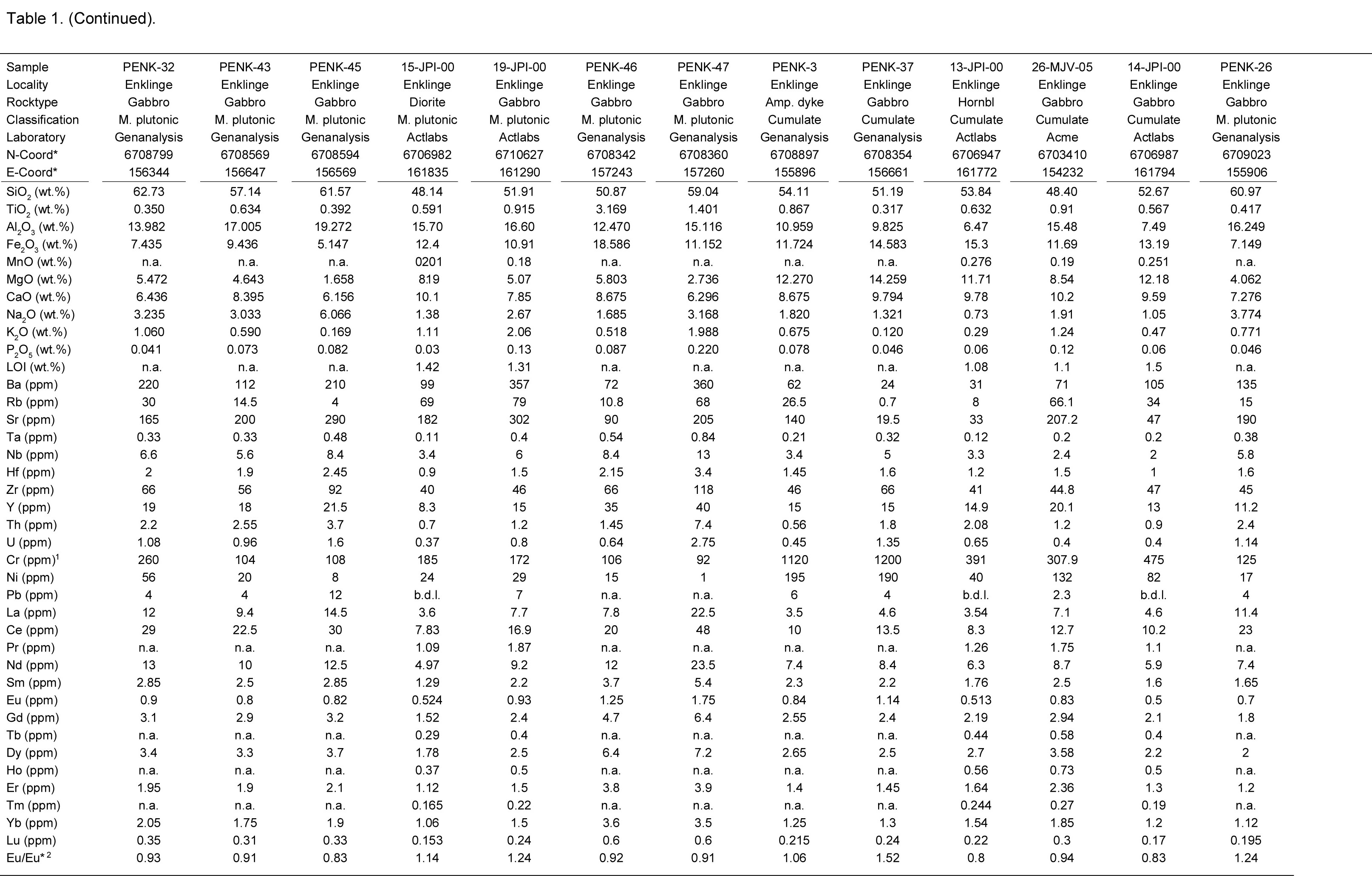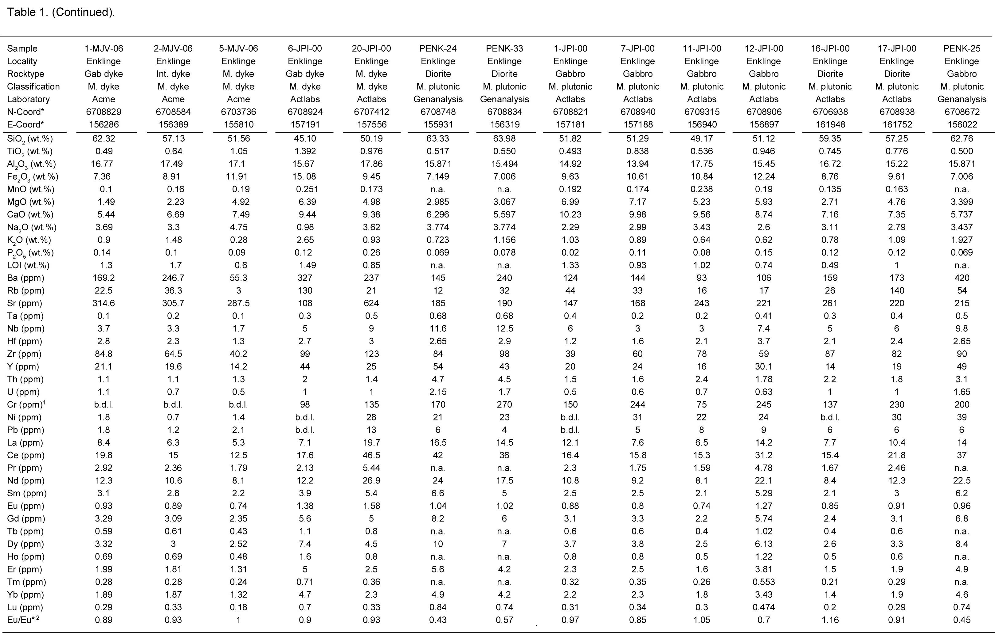 The mafic cumulates from Enklinge also stand out in the trace element data. They show very low LILE values as well as low Th, Sr, Zr and Nb concentrations but very high Cr and Ni concentrations. In the multi-element diagram, the cumulate group has similar pattern as the other mafic rocks but their REE pattern is fairly flat (Fig. 7). The Enklinge cumulates also show small Eu anomalies, with Eu/Eu* ratios varying from 0.8 to 1.52.