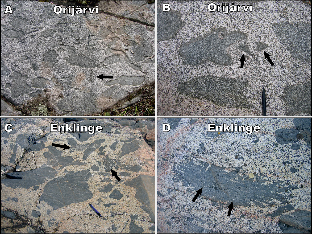 Field photos from the study areas. A) Magma mingling and mixing from the Orijärvi batholith. A few mafic enclaves, one of them indicated by a black arrow, show incipient magma mixing between mafic and felsic endmembers resulting in intermediate composition and a blurred boundary between the enclave and the felsic magma. B) Detailed photo from a mafic enclave from Orijärvi. The felsic magma has scavenged two small mafic fragments (black arrows) from the parent enclave on the left. On the left side of the pen there is an enclave with an intermediate composition similar to the one in Fig. 3A. C) Mafic and felsic magma mingling and mixing in the northern part of Enklinge. Black arrows indicate two enclaves with incipient magma mixing. D) The classical mafic enclave from Enklinge, first described by Sederholm (1934) and also found on the front cover of Lithos Vol. 116 (Eklund et al., 2010). The outline of the enclave is resorbed by the surrounding felsic magma and a few feldspar phenocrysts are enclosed in the enclave (black arrows), suggesting coeval mafic and felsic magmas.
