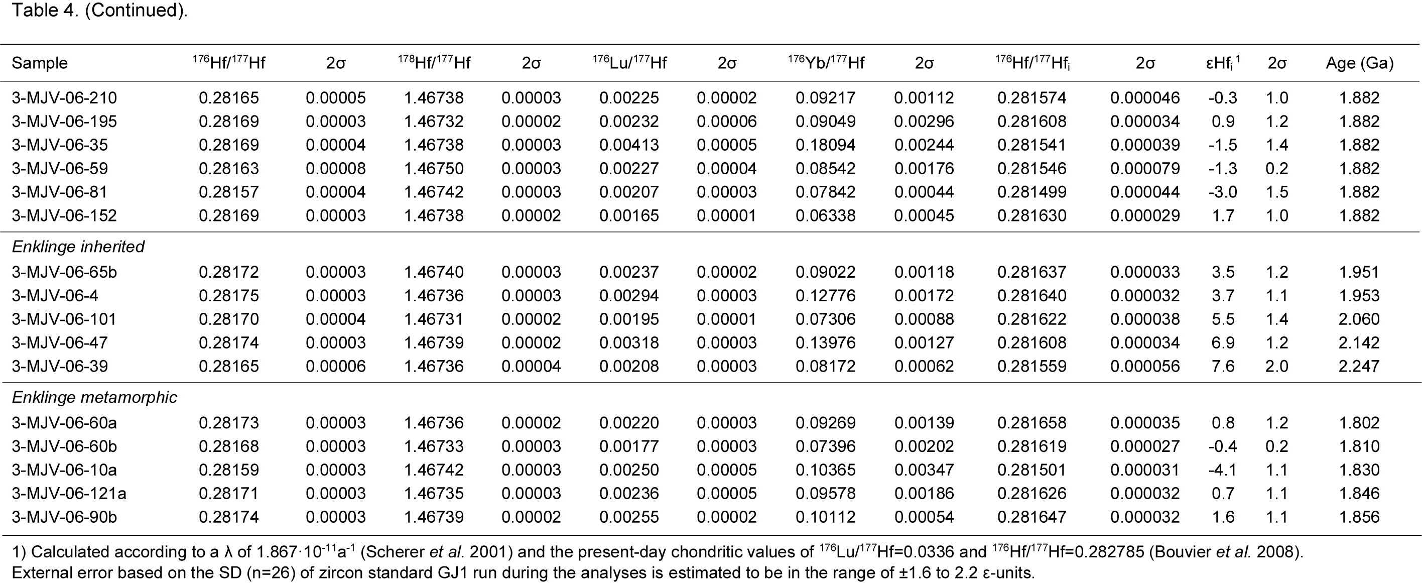 For the calculation of εHf values we use present-day chondritic 176Hf/177Hf=0.282785 and 176Lu/177Hf=0.0336 (Bouvier et al., 2008). The zircon standard GJ-1 was run at frequent intervals for quality control. Multiple LA-MC- ICP-MS analyses, using the same instrumental parameters, of the reference zircon GJ-1 during the course of the present study yielded a 176Hf/177Hf of 0.28194±6 (1σ, n=26, which is just within error to results obtained by solution MC-ICP-MS analyses for GJ1 (0.281998±7, Gerdes and Zeh, 2006; 0.282000±5, Morel et al., 2008). Based on this result, analytical reproducibility is estimated to be in the range of ±1.6 to 2.2 ε-units. The Lu-Hf isotopic data from the two samples (the Orijärvi granodiorite and the Enklinge granodiorite) are presented in Table IV.