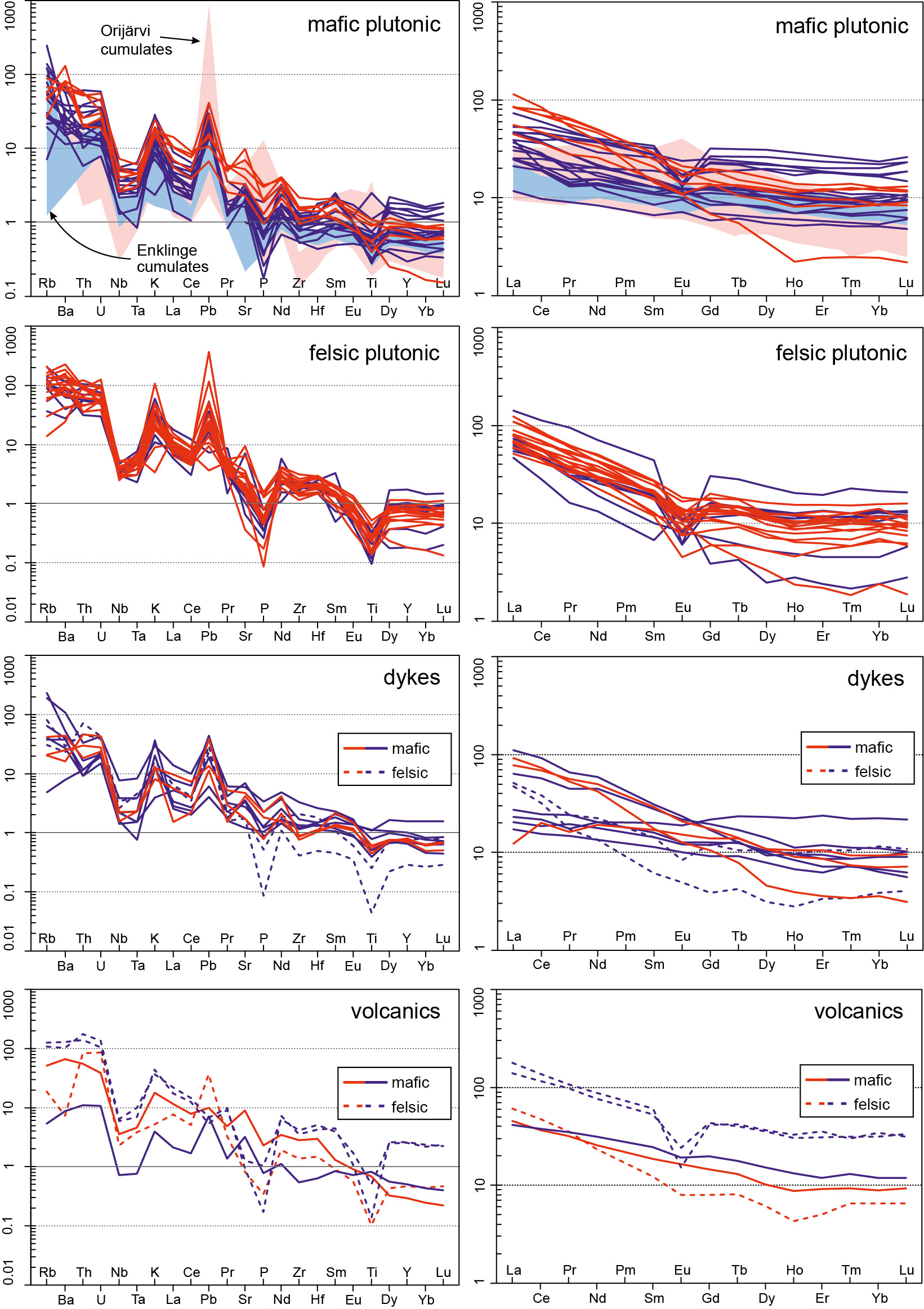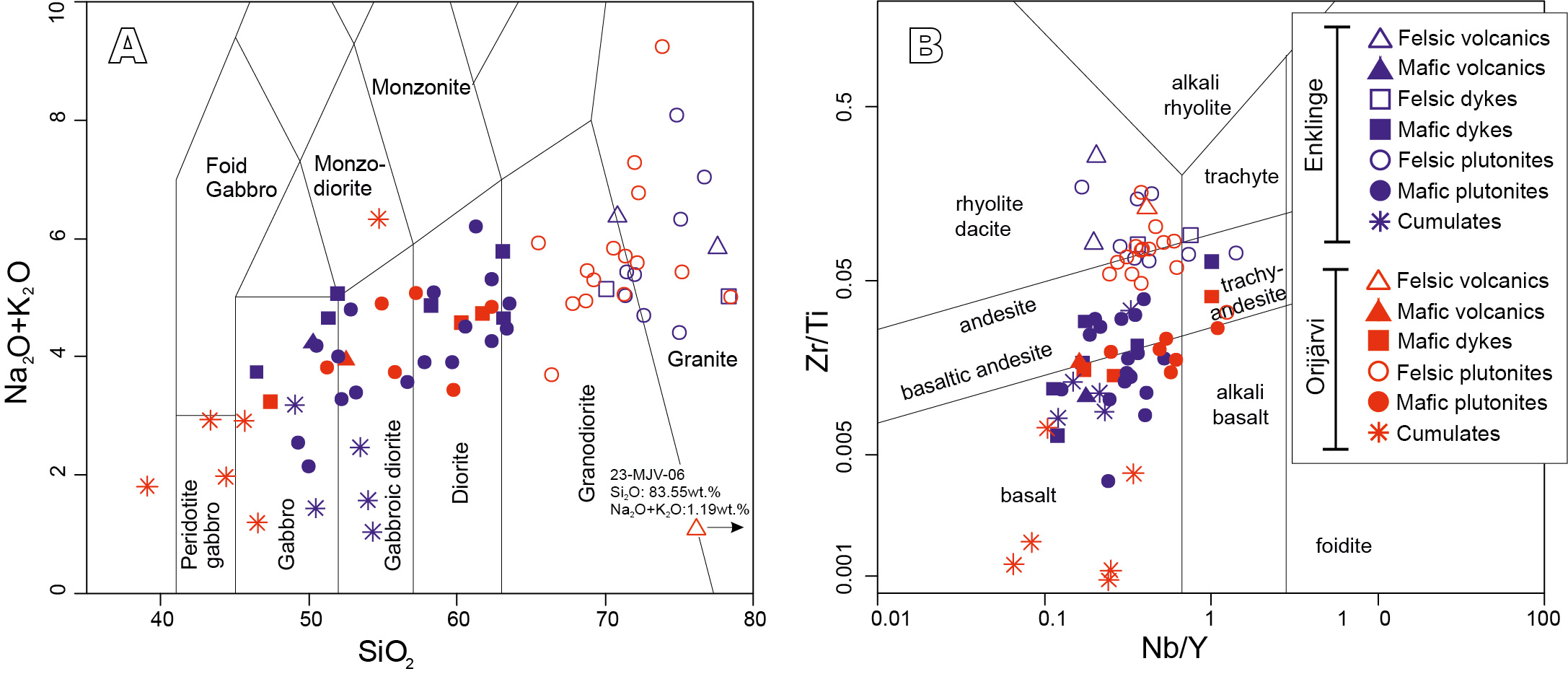 The log Zr/Ti vs. log Nb/Y classification diagram (Winchester and Floyd, 1977, modified by Pearce, 1996) was used to study the degree of alteration of the samples (Fig. 4B). All the samples form a rather tight and continuous trend from basalts to rhyolites, as in the TAS diagram (Fig. 4A), which supports their unaltered nature. The altered rhyolite sample from Orijärvi plots in the same group as its plutonic counterparts.