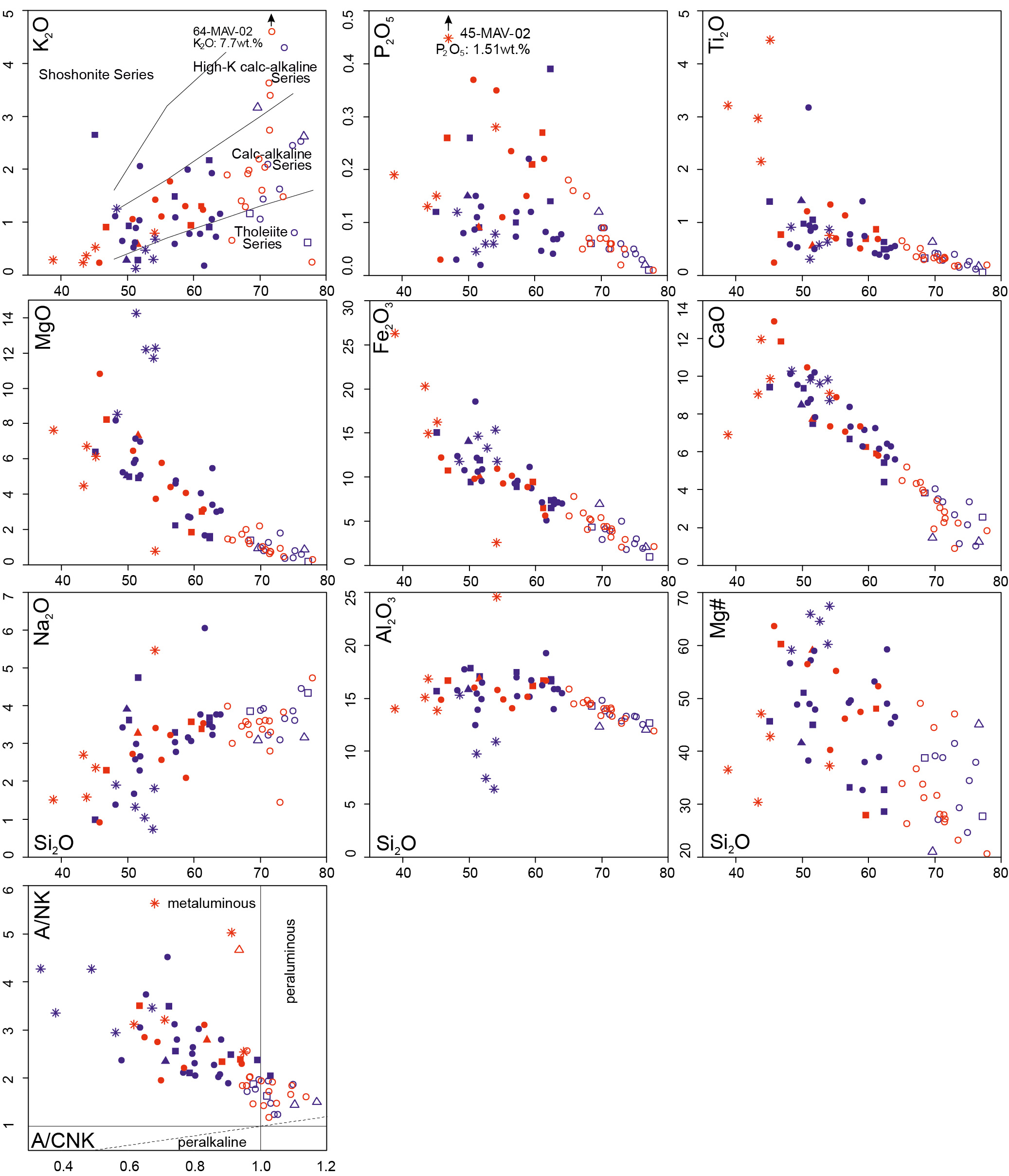 Selected major element vs. silica diagrams. K2O vs. SiO2 classification after Peccerillo and Taylor (1976). Mg# (100*MgO/(FeOt+MgO)), A/NK (Al2O3/(Na2O+K2O)) and A/CNK (Al2O3/(CaO+Na2O+K2O)) calculated with GCDkit-software (Janousek et al., 2006). All values in weight% except Mg# and values in the A/CNK diagram. Symbols as in Figure 4.