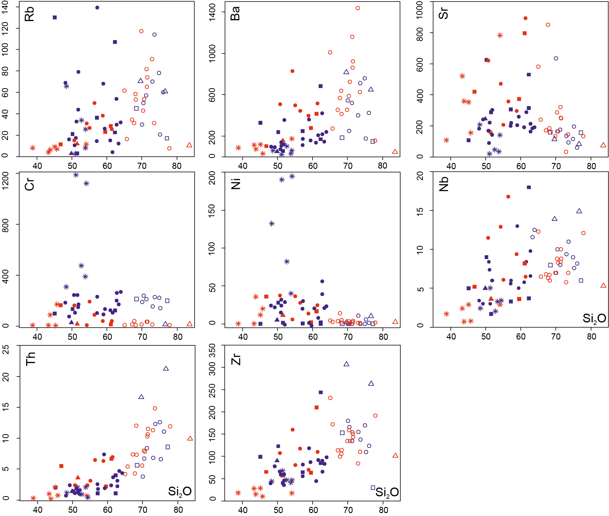 In summary, the co-genetic relation between intrusive and extrusive rocks is supported by their similar whole rock compositions. In addition, the coeval relation between mafic and felsic magmatism is supported by field observations.