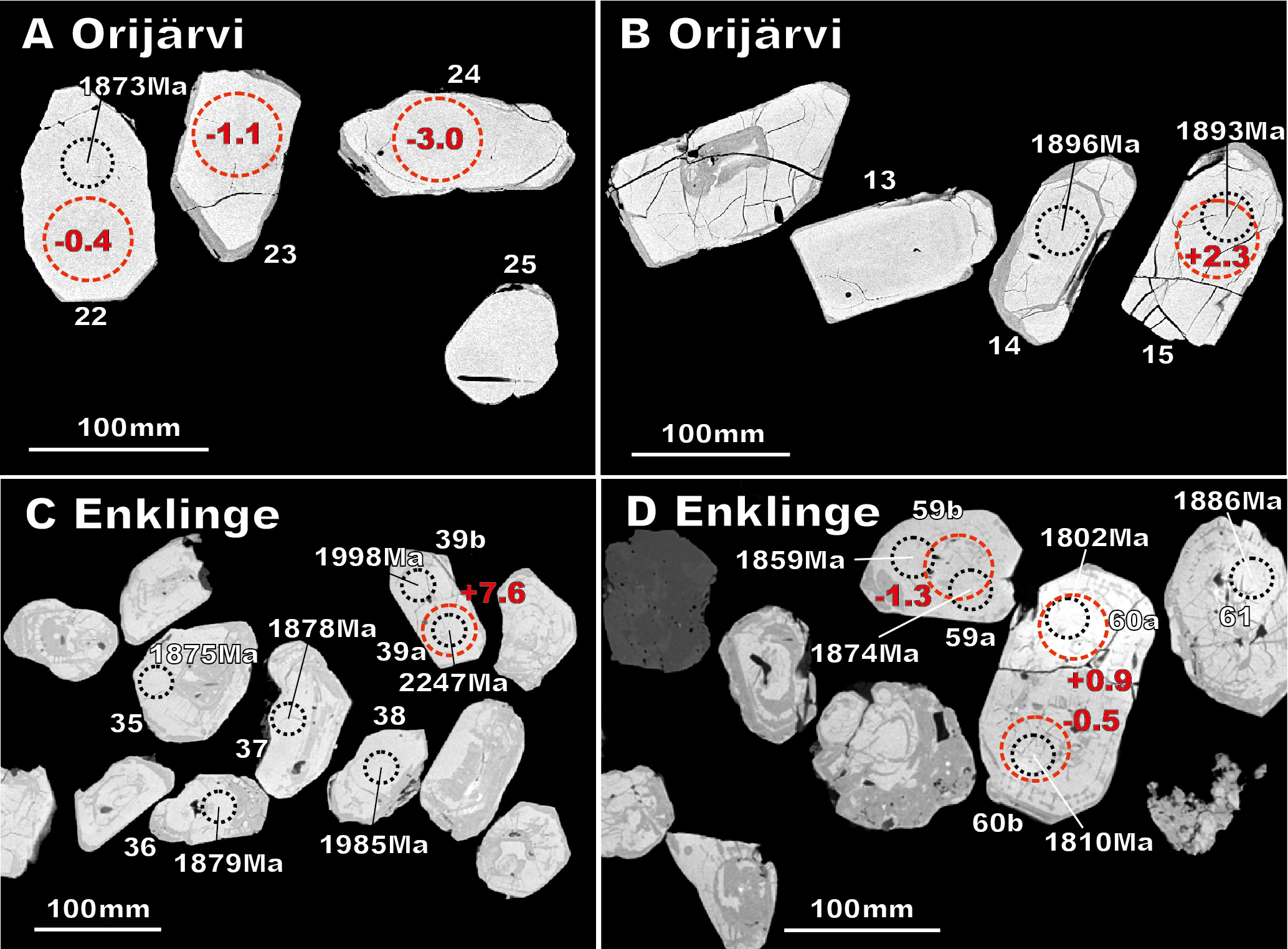 Back-Scattered Electron (BSE) images of representative zircons from the Orijärvi granodiorite (A and B) and from the Enklinge granodiorite (C and D). Black dashed circles represent U-Pb spots (25μm) with 207Pb/206Pb age; red dashed circles represent Lu-Hf spots (50μm) with initial εHf(t) value. More detailed analysis data available in ELECTRONIC APPENDIX (Tables II and IV).