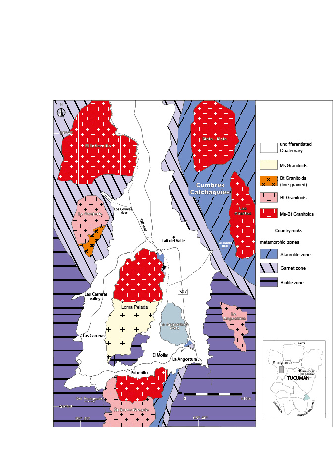 The Loma Pelada Granite is located in the central part of the Tafí del Valle. It constitutes an elongated N-S trending body that crops out along 40km2 (Fig. 2) and intrudes biotite or biotite + garnet schists.