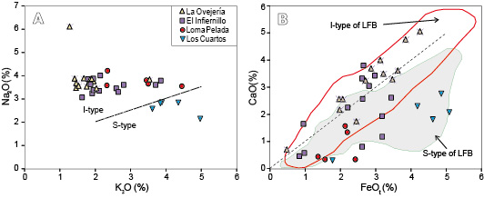 A) Na2O vs. K2O diagram for the intrusive bodies of the Tafí del Valle region. Dashed line is the limit of I- and S-type granites proposed by Chappell and White (1974). B) CaO vs. total FeO diagram (Chappell and White, 2001). The line represents compositions with equal wt.% CaO and total FeO. The area marked by a red line represents the I-type granites and the grey area the S-type granites of the Lachlan Fold Belt (LFB).