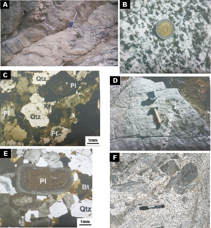 A fine grained-size facies is observed in the southern sector (Fig. 4D) consisting of plagioclase, quartz, very scarce microcline, biotite and scarce titanite. This facies shows an inequigranular and xenomorphic texture (Fig. 4E). Plagioclase (56-64vol%) constitutes subhedral and zoned crystals; quartz (24-29vol%) and small microcline (<2vol%) are present as anhedral crystals; titanite forms anhedral and fractured grains. Pistacite and muscovite are present in biotite (10-15vol%) alteration areas.