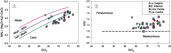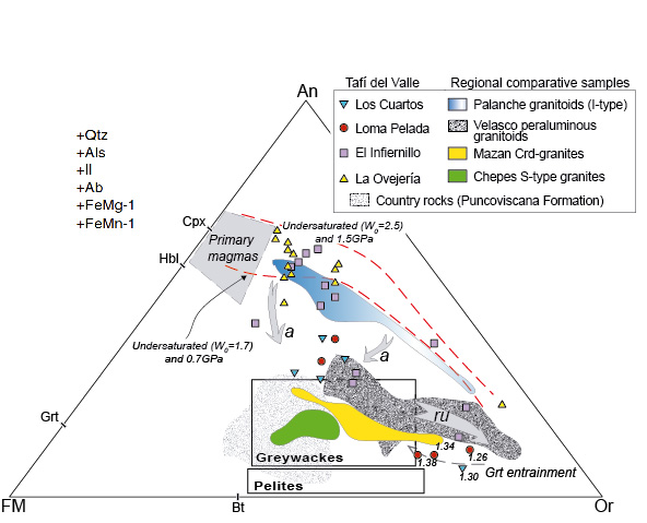 Loma Pelada and Los Cuartos granitoids show highly evolved compositions, typical of granites segregated in the last stages of magmatic differentiation, or anatectic granites. They show increasing peraluminosity and tend to approach to the host rocks location in the projected diagrams. These granitoids are located at the end of the compositional range of the regional S-type magmas, which are related to the anatectic melts generated in the Puncoviscana Fm.
