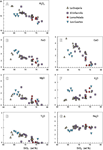 Silica variation diagrams (Harker) plotting granitoids of the Tafí del Valle area. Linear trends are described by La Ovejería and El Infiernillo samples. Granitoids of Loma Pelada are grouped between 73 and 75wt.% SiO2. Los Cuartos samples are separated from the general trends described by the other units (see further explanations in the text).