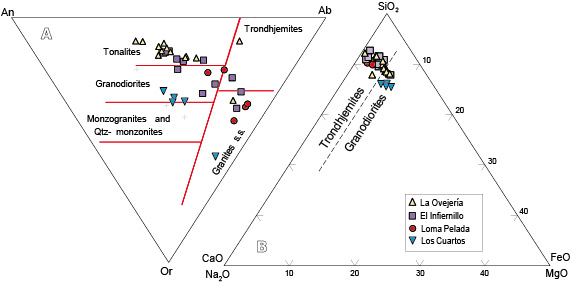 In the Ab-Or-An diagram (O’Connor, 1965; Fig. 7A), a continuous evolution from tonalite to granite fields is observed among samples of the La Ovejería, El Infiernillo, and Loma Pelada. Los Cuartos samples, which show higher Or proportions, are mostly located between the granodiorites and monzogranites field. According to the SiO2-Na2O+CaO-FeOt+MgO diagram (Johannes and Holtz, 1996) (Fig. 7B), samples from the La Ovejería, El Infiernillo and Loma Pelada intrusive bodies are defined as trondhjemites. They present low FeO and MgO contents with Fe2O3+MgO+MnO+TiO2<5%.