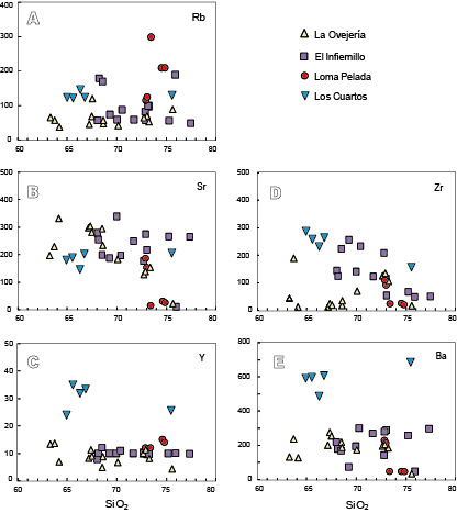 Variation diagrams of some trace elements vs. SiO2. La Ovejería and El Infiernillo granites present similar trends, although a greater scattering is observed in the El Infiernillo samples. The Loma Pelada samples are separated in two groups. Los Cuartos samples present trace elements contents that differ from those trends pointed by the La Ovejería and El Infiernillo granitoids.
