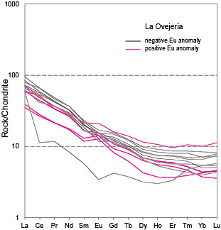 Chondrite-normalized (Nakamura, 1974) REE plots. Tonalites and granodiorites of La Ovejería in general show subparallel patterns, with a slight negative Eu anomaly, although 5 samples show positive Eu anomaly. In both cases the patterns generated are almost flat (Eu/Eu * ~ 0.70-1.29, average = 0.98). LaN/YbN ratio ranges from 6.63 to 17.46 (average 11.80).