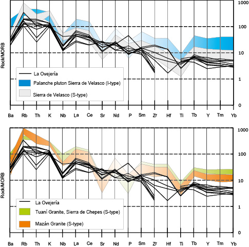 Thompson normalization plot rock/MORB. La Ovejería pluton is compared with other S- and I-type regional granitoids. In general, La Ovejería shows lower trace element contents than the comparative I- and S-type granitoids.