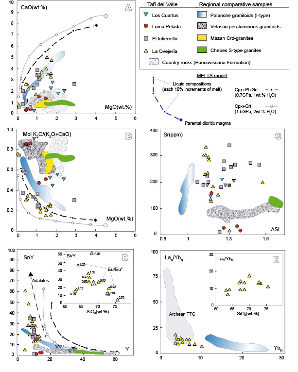 The new trace element data of the La Ovejería intrusive unit, along with the significant geochemical data from El Infiernillo, Loma Pelada and Los Cuartos granitoids allow a comparison of the lower Paleozoic granitoids of the Tafi del Valle region with the regional coeval magmatism. In order to constrain the petrogenetic considerations and the geochemical variations occurred during the emplacement stage of these magmas, models obtained by the Rhyolite-MELTS program (Ghiorso and Sack, 1995; Asimow and Ghiorso, 1998; Gualda et al., 2012) and experimental examples of magmatic evolutions have been used (Figs. 11and 12).