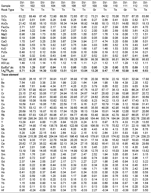 I.I. Major (wt.%) and trace element (ppm) composition of representative samples from the La Ovejería Tonalite