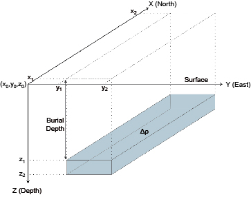 Scheme representing a rectangular prism with aspect ratio 9:3:1, corresponding to the anomalous bodies modelled in this study. The coordinate system has the X axis pointing North, the Y axis to the East and the Z axis the depth. Δρ: density contrast.