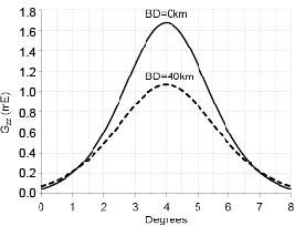 In the first test the anomalous body has a density contrast of 500kg/m3 and a burial depth z1 covering the common range of crustal depth, i.e. 0≤z1≤40km. After estimations, we find that the minimum dimensions of the anomalous body that can be resolved by the Gzz component within this depth range is Δx=22.5km, Δy=7.5km, and Δz=2.5km. The resulting maximum value of the Gzz component is 1.7mE, if the anomalous body is located at the Earth’s surface (z1=0km) and 1.1mE when the burial depth is z1=40km (Fig. 2). Note that, at this depth, the gradient signal is in the limit of GOCE resolution (1mE).