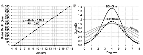 Thickness (Δz) of the anomalous density body as a function of its burial depth. All models have approximately the same maximum signal in the vertical component Gzz and keep the same aspect ratio (9:3:1). B) Gravity gradients Gzz (vertical axis) generated by anomalous density bodies. The horizontal axis represents the East direction. Continuous and dashed black lines correspond to a density anomaly of dimensions Δx=49.5km, Δy=16.5km, Δz=5.5km, and a density contrast of 50kg/m3 at Burial Depths (BD) of 0 and 40km, respectively. Grey lines correspond to models of different dimensions with a density contrast of 50kg/m3 at burial depths in the range of 100–400km (see Table 1).