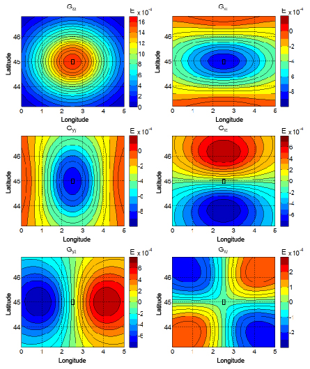In the previous section, we have shown the minimum size and burial depth of a density anomaly producing a detectable gravity gradient signal in the Gzz component. However, both size and burial depth of the density anomaly influence in a different way the wavelength of the gravity gradient variations and particularly, the spatial distribution of maximum and minimum (extrema) values. Figure 4 shows the six gravity gradient components for an anomalous density body of 22.5x7.5x2.5km, Δρ=500kg/m3 and burial depth z1=0km computed at 5km height. The Gzz component delineates a maximum value miming the planar shape of the density anomaly, whereas the Gxx component shows a quadrupole distribution with the minimum values within the anomalous body and the maximum values close to the N-S bounds of the anomaly. The Gyy component shows an elongated minimum centered on the anomalous body with values increasing outwards. The different shape of the Gxx and Gyy components is related to the elongated shape of the density anomaly at the low computation height. Components Gxz and Gyz display a bipolar distribution with relative extrema values distributed symmetrically with respect to the width and length axes crossing the center of the body, respectively (y and x axes). Maximum and minimum values roughly coincide with the lateral sides of the anomalous body. Finally, component Gxy exhibits a quadrupole pattern with alternating maximum and minimum values roughly coinciding with the corners of the anomalous body. In summary, in the case that the dimensions of the anomalous body are large relative to the computation height, the relative extrema distribution, i.e. the wavelength of the gravity gradient components is sensitive to the boundaries of the density anomaly, which allows for identifying its shape. It is worth noting that, due to the low computation height (5km), the half wavelength in all components is <20km, which is below the spatial resolution of GOCE.