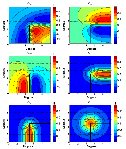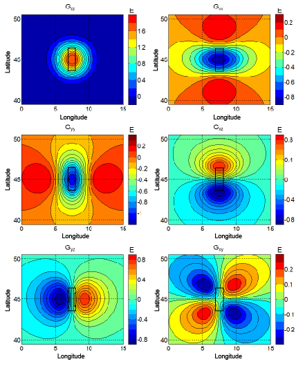 Gravity gradient components for an anomalous density body of 22.5x7.5x2.5km and Δρ=500kg/m3 and burial depth z1=0km, computed at a height of 255km, the mean satellite altitude.