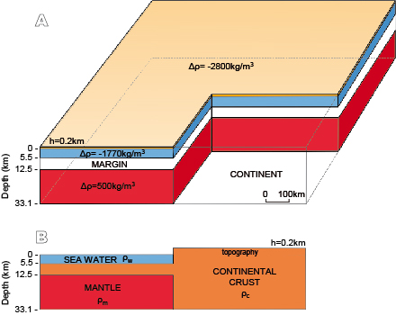 A) Cartoon showing the 3D modelled crustal structure associated with a passive continental margin resembling the NW corner of the Iberian Peninsula. Three layers have been modelled (topography: orange, seawater: blue, and lithospheric mantle: red) with a density contrast (Δρ) relative to the crust, also seen in Fig. 7B. B) Simplified 2D crustal structure of the passive margin model and actual densities (ρc=2800kg/m3; ρm=3300kg/m3; ρw=1030kg/m3). The scale of the topography has been exaggerated.