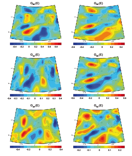 To compare our model with the measured signal, gravity gradients are computed in the Local North Oriented Frame (LNOF) from the disturbing potential over the Iberian Peninsula and nearby regions, including the western Mediterranean and North Africa regions (Fig. 9). All computations are incorporated on a 10x10min grid at the mean satellite altitude of 255km, taking the WGS84 as the reference ellipsoid.